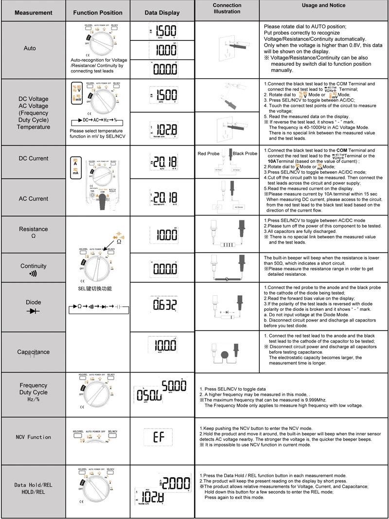 Измерьте напряжение переменного/постоянного тока, переменный/постоянный ток, сопротивление, емкость, диод, тестирование непрерывности, частоту и т. д.