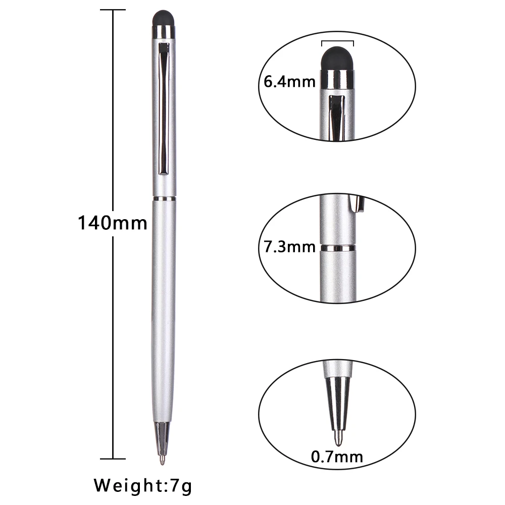 100% новый и высококачественный Тип: шариковая ручка с сенсорным экраном Материал корпуса: пластик Размер: 14 мм Перо: 0,7 мм Цвет заправки: черный Цвет ручки: серебристый