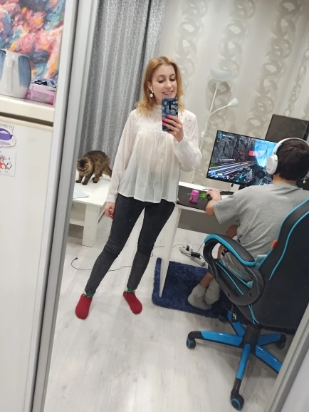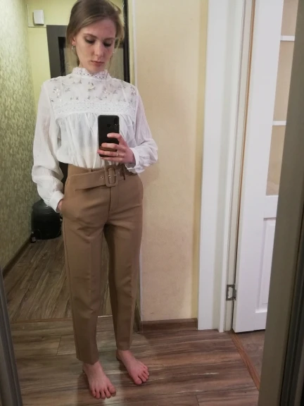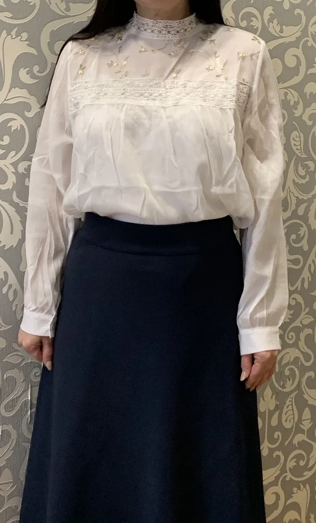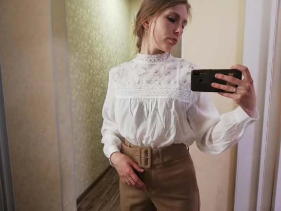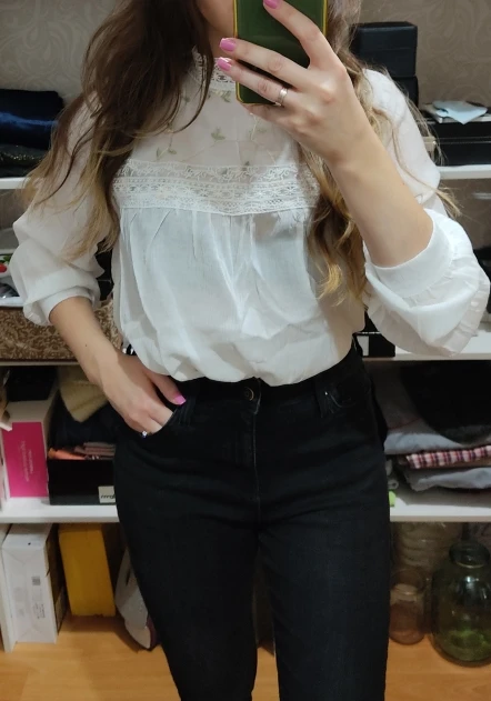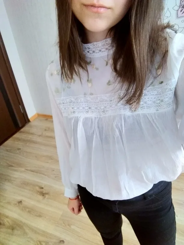 Блузка просто до невозможности красивая, всё очень аккуратно сшито, ничего нигде не торчит. Только оказалась чуть белее чем на фото, я ожидал бежевую, но она белая, но это мне не мешает. Размер идеально сел на меня, мой обычный размер s/xs, но есть иногда проблемка с размерами, ибо рост высокий, но эта блузка более чем оправдала мои ожидания. А, ещё доставка была ровно две недели, огромное спасибо продавцу за такую быструю доставку.