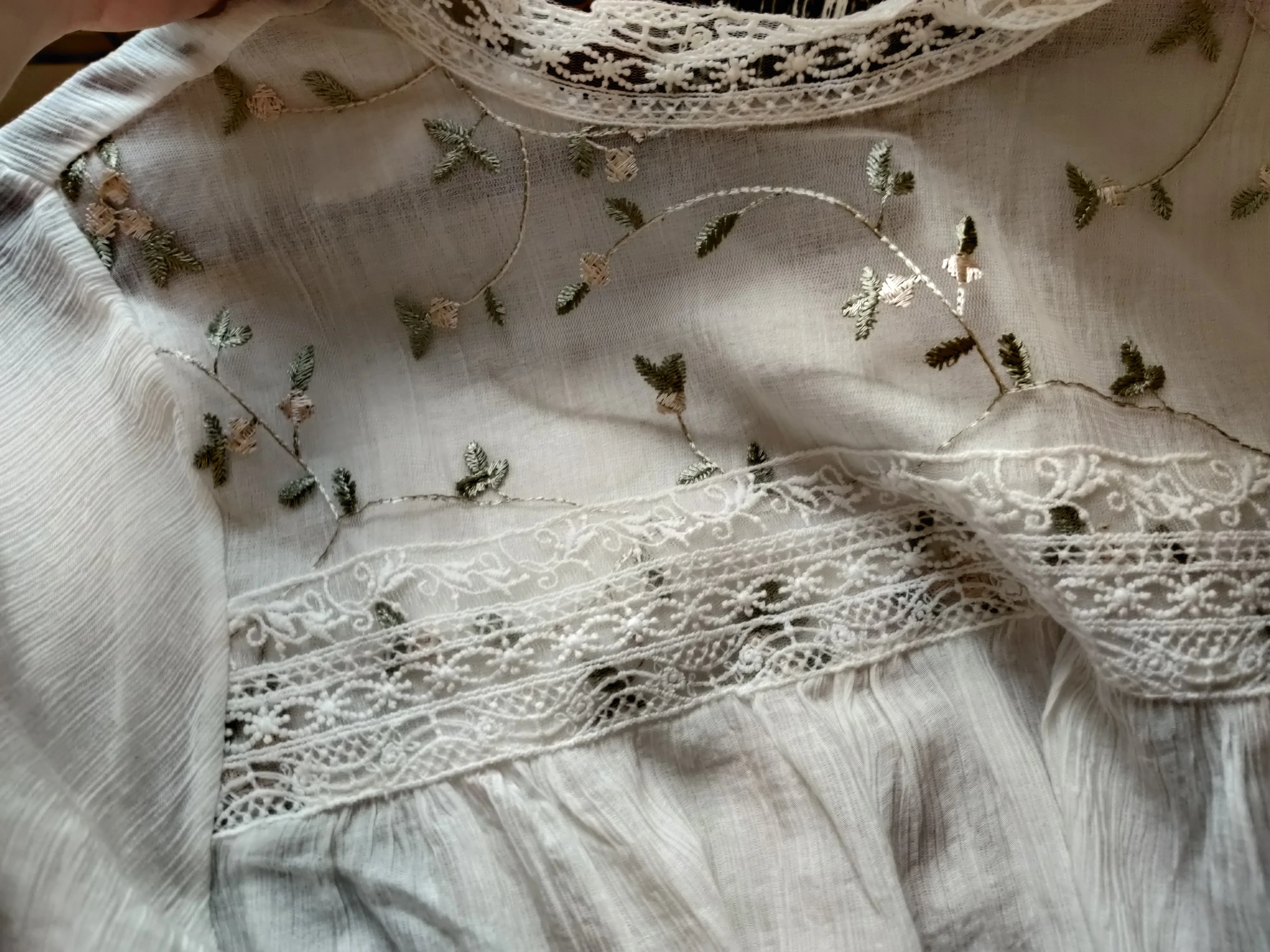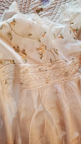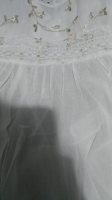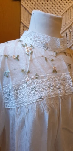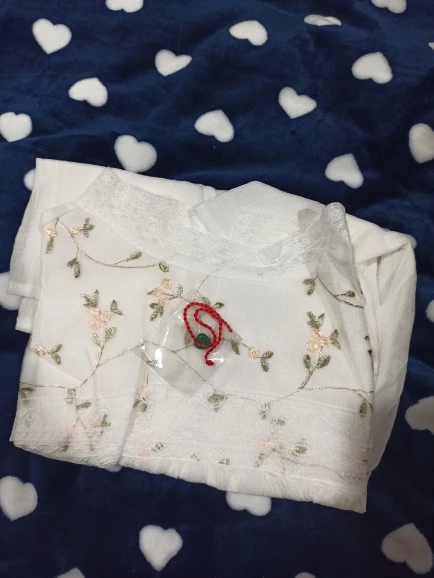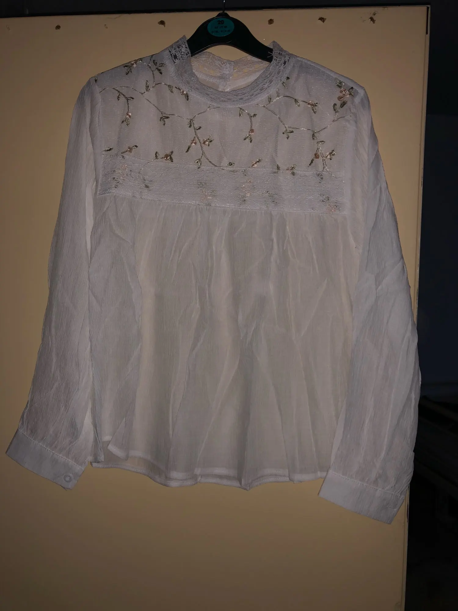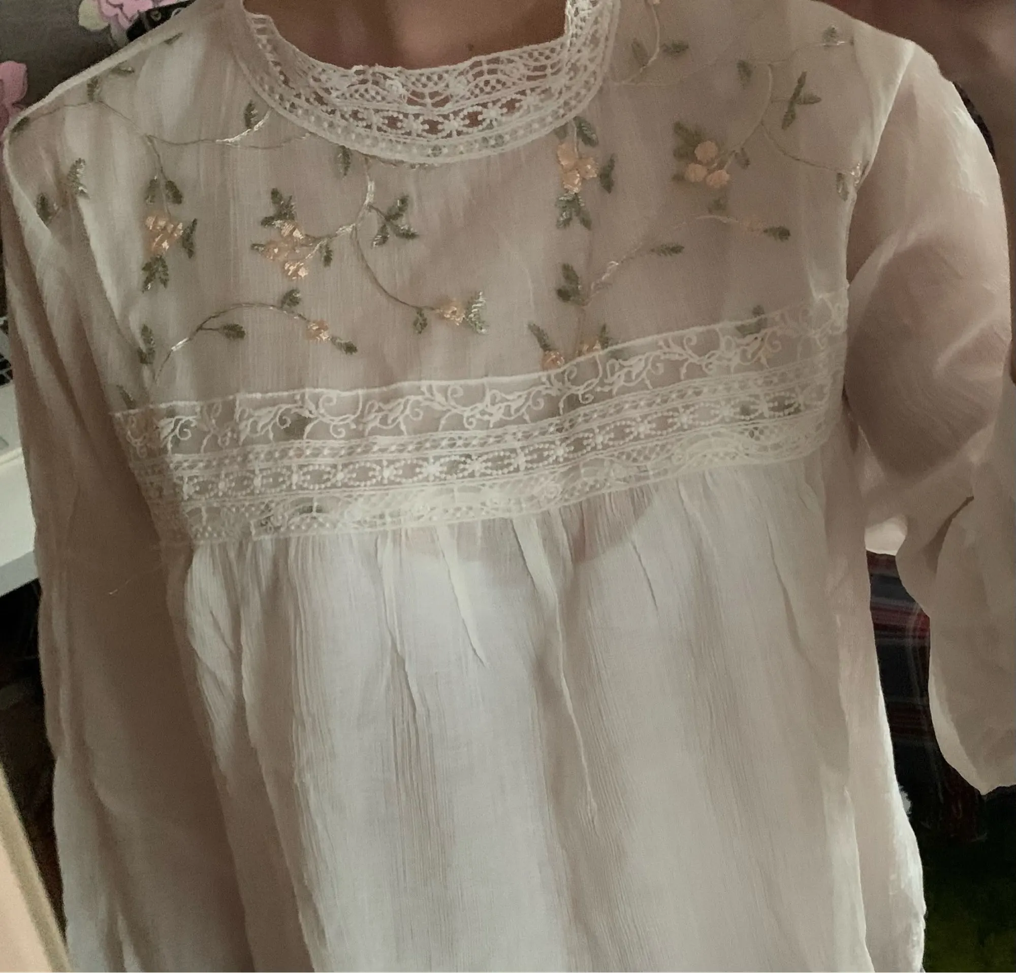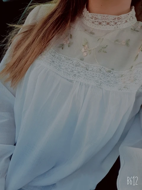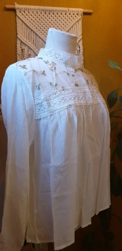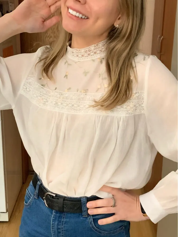 Блузка очень красивая и качественная. Ткань а основном тонкий шифон. Сама блузка полупрозрачная, но спереди на груди двойной слой ткани, точнее пришита ткань с вышивкой, поэтому в этом месте просвечивает меньше. Ткань, фурнитура, вышивка всё качественное, нитки не торчат, всё аккуратно сделано. Носить буду под заправку, потому что в свободном виде смотрится как сорочка. У продавца один размер на параметры обхват груди 88 см, обхват талии 62 см плечи 40 см и длинна рукава 53-54 см подошло замечательно. У тех у кого длинна рукава больше, будет коротковато. Вещь очень хорошая, однозначно носить буду. Рекомендую.