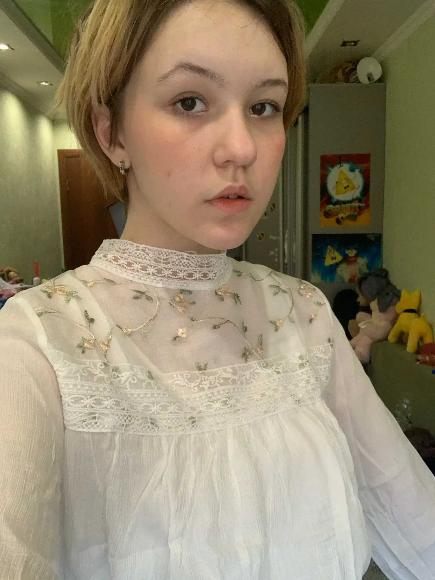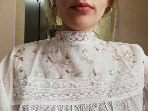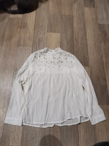 Блузка очень приятная, свободная, обычно беру блузки XXS, поэтому такая блузка очень свободная. Нет дырки для застегивания пуговки на шеи.