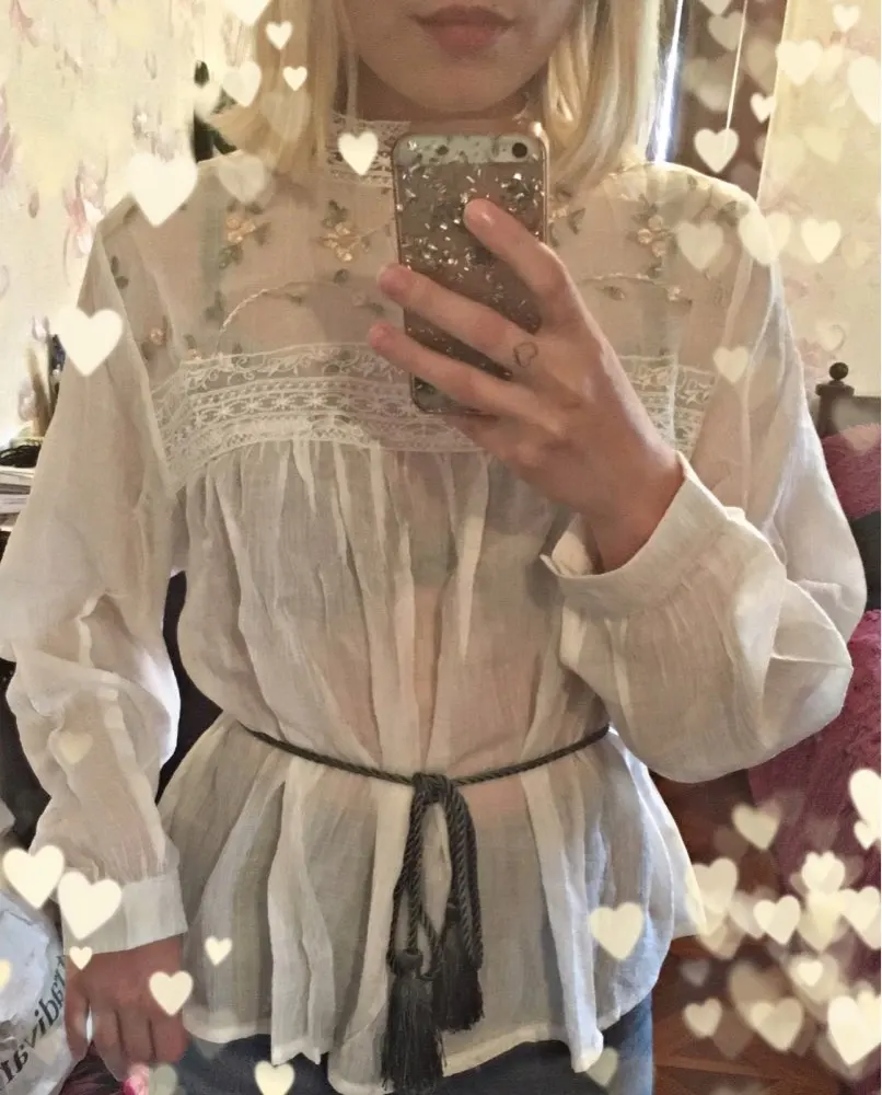супер милая блузка! свободная в талии, даже слишком, на ог 88 села тоже достаточно свободно. по ткани- гольная синтетика, прям неприятно. но носить буду, ибо очень милая. и ещё она полупрозрачная.