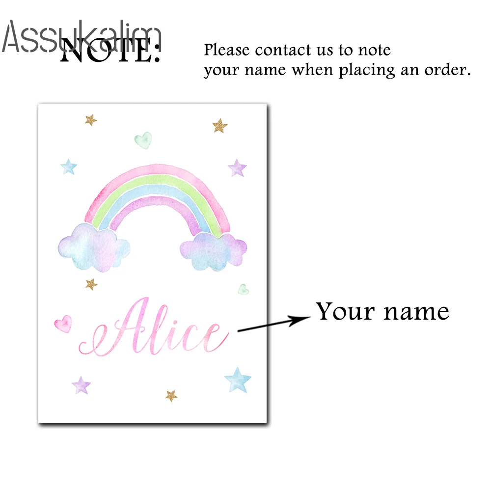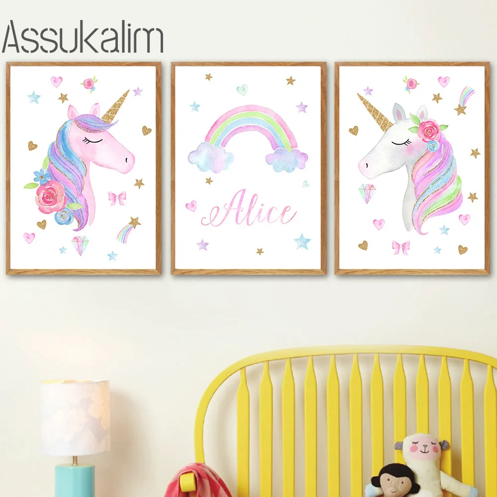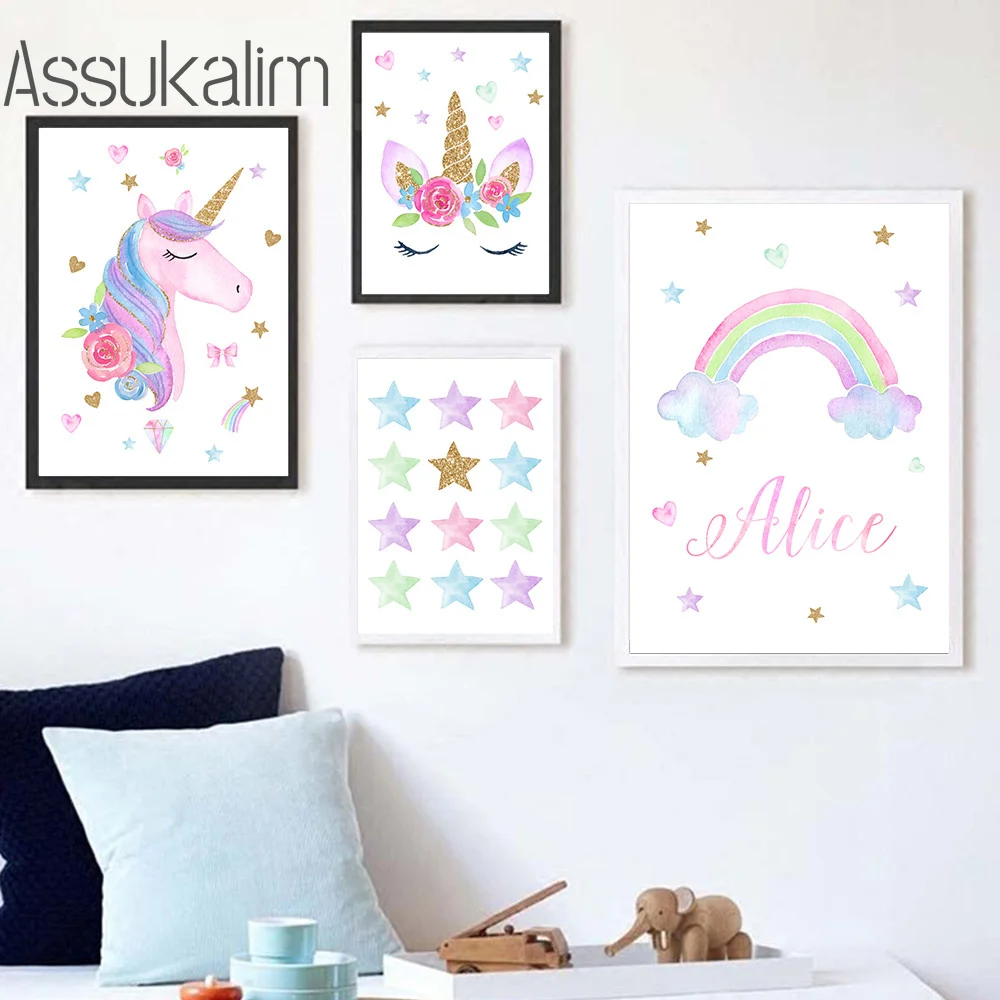 Постер в скандинавском стиле с именем на заказ, холст, плакаты, единорог, звезды, декор детской комнаты, искусственная живопись, цветы, настенные картины для детской комнаты