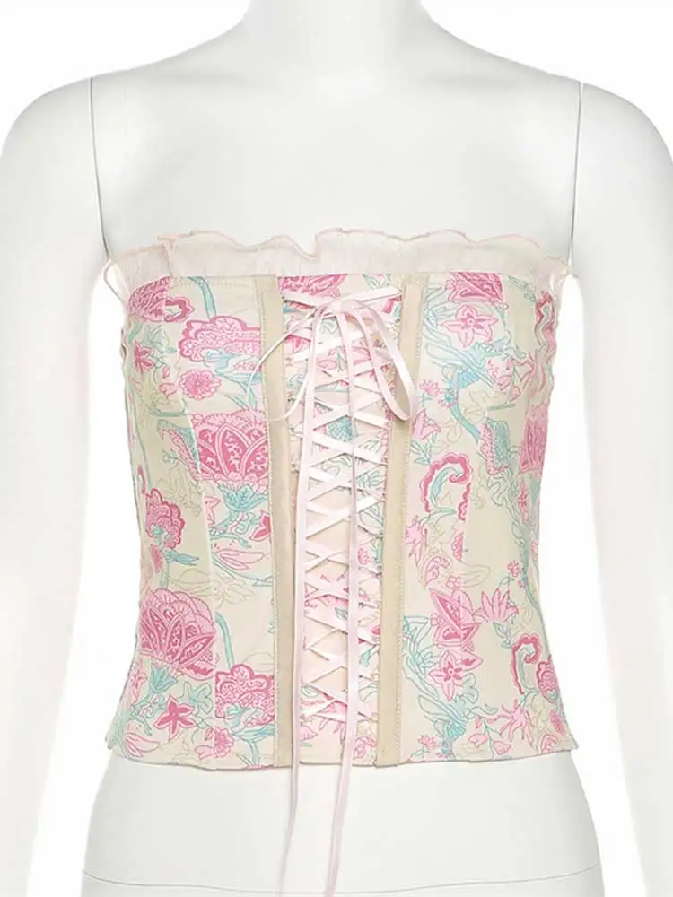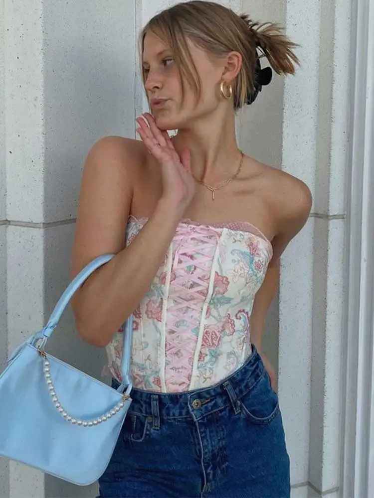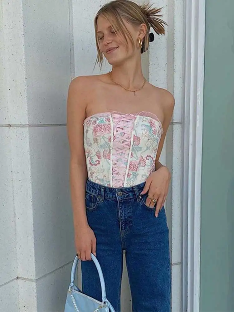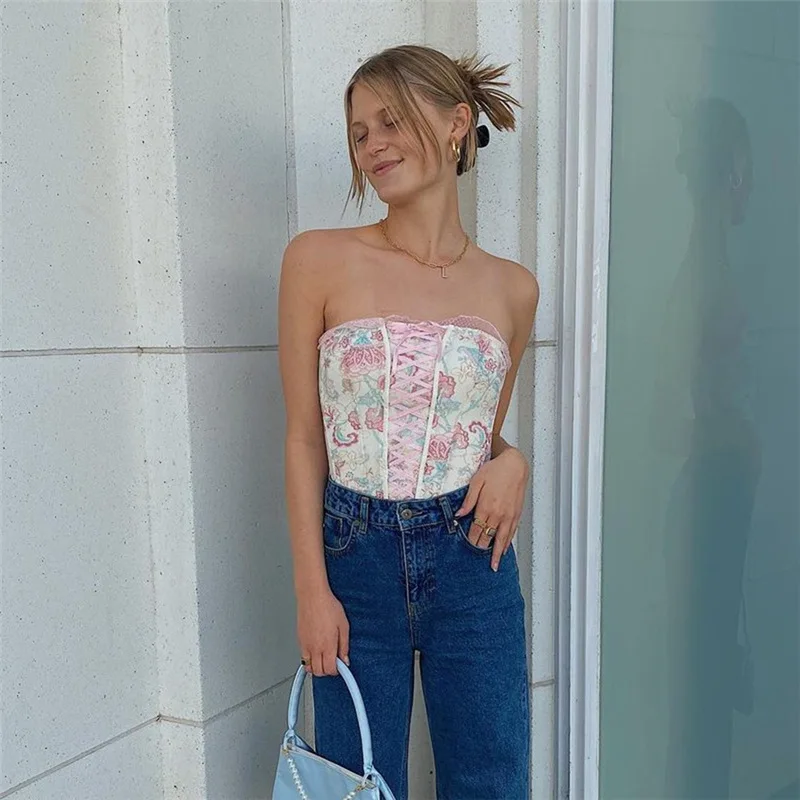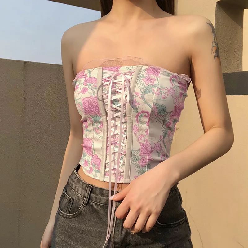 Женский Короткий Топ без бретелек, розовый облегающий топ с цветочным рисунком, лето 2022