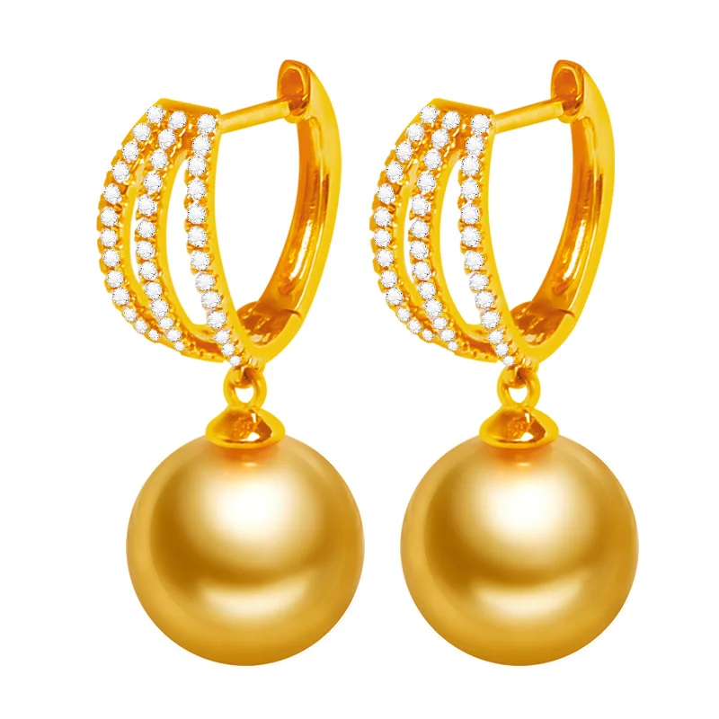 Серьги-подвески женские из желтого золота, 9-10 мм, с натуральным морским жемчугом