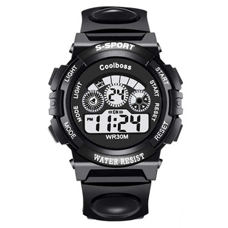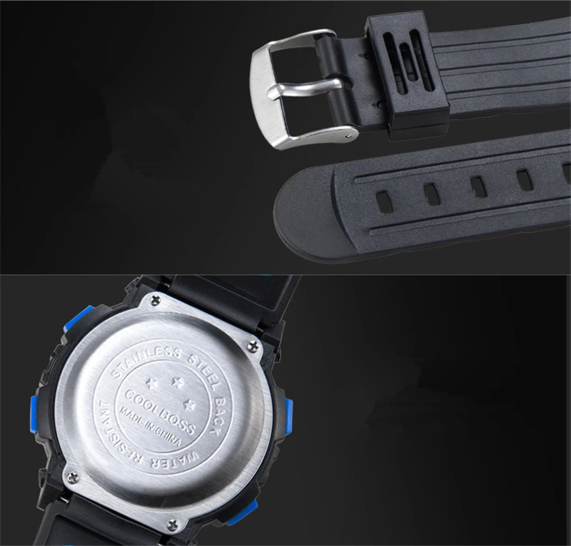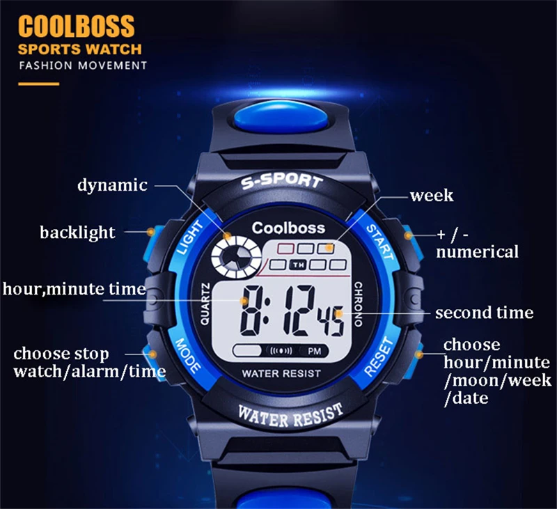 Бренд: Coolboss Толпа: дети Материал ремешка: Резина Материал зеркала: акрил Функции: светящийся дисплей, секундомер во времени, календарь дня недели, режим будильника, ежечасный Посылка 1 часы (Водонепроницаемость) можно только брызгать немного воды, нельзя мыть или купаться, плавать, нырять.