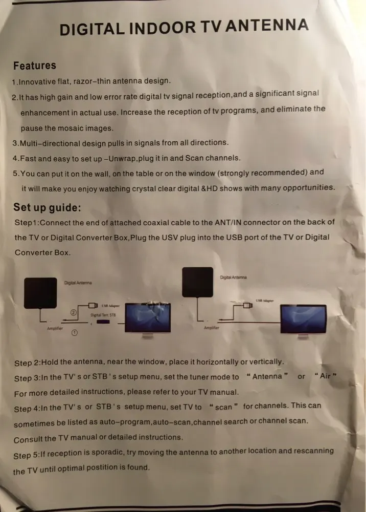 Я заказал цифровую HDTV антенну 17 декабря 2020, и я получил антенну 12 января 2021, немного меньше месяца, и антенна показалась в хорошем состоянии. Выглядит хорошо и до сих пор после автоматического сканирования новых/старых каналов все четко и прекрасно работает.