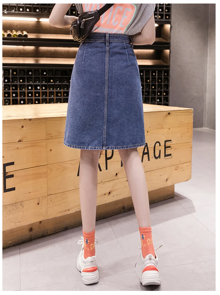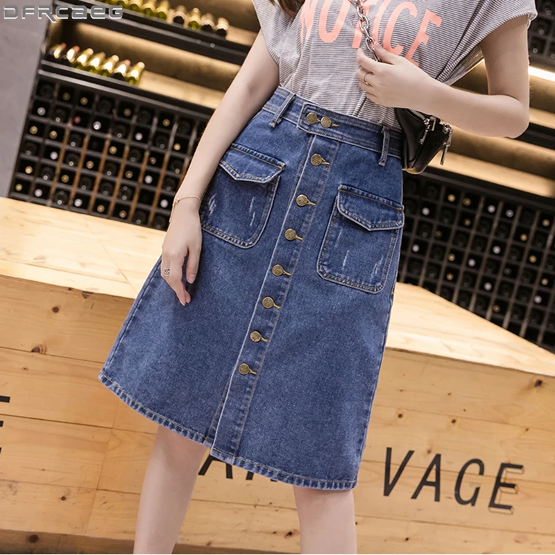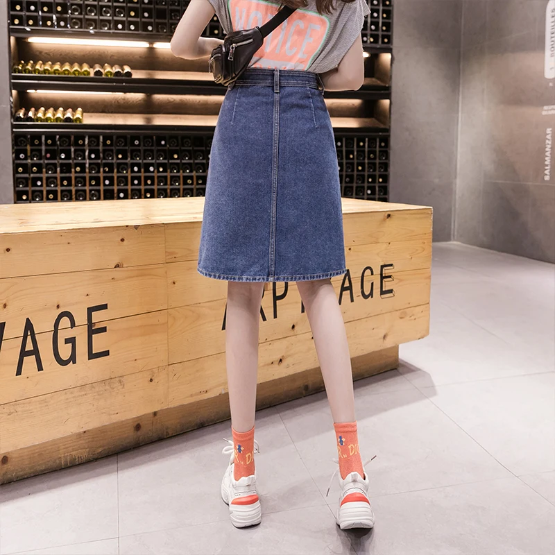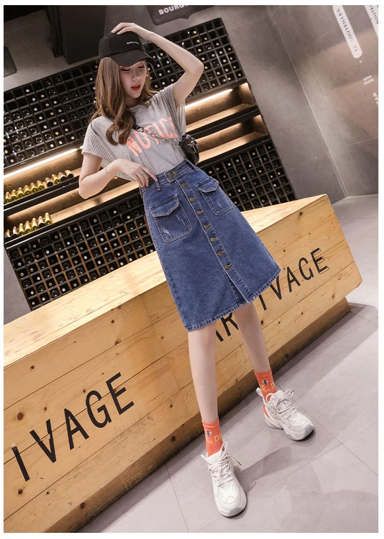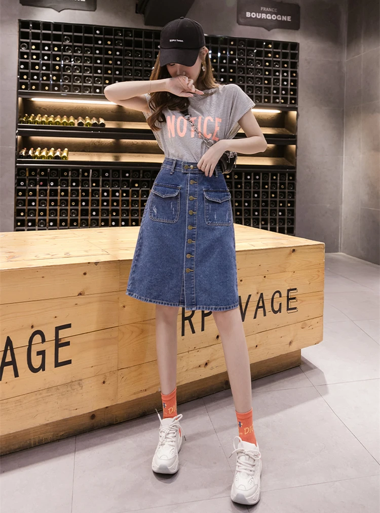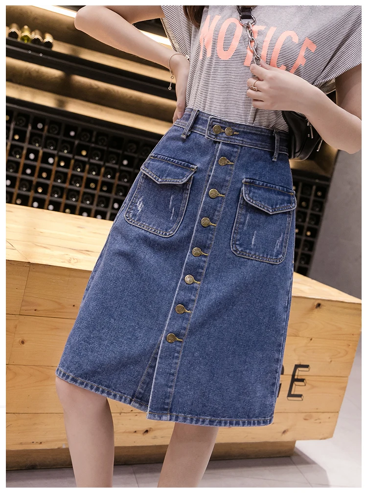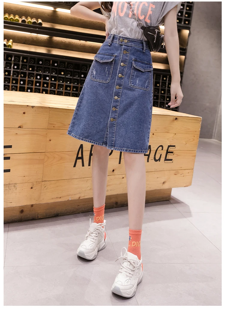 Юбка женская джинсовая средней длины, Повседневная Уличная размера плюс трапециевидная с завышенной талией, на одной пуговице, рваная, с царапинами, на лето