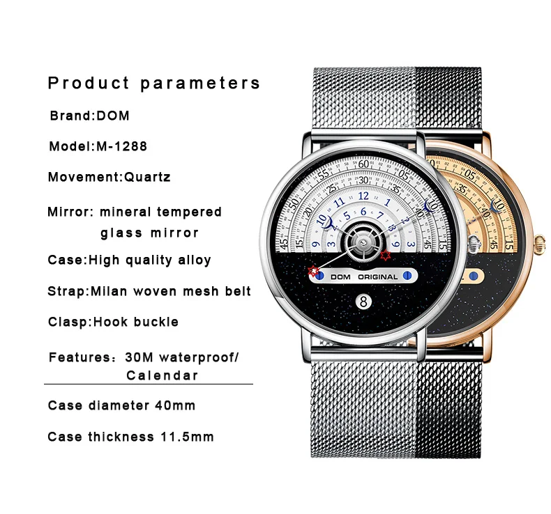 Часы мужские DOM, кварцевые, водонепроницаемые, с сетчатым ремешком...