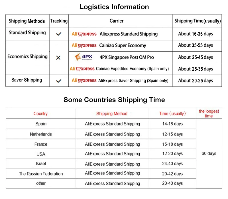 1. Большая часть посылка будет отправлена с номером отслеживания в течение 1-3 рабочих дней 2. Перед размещением заказа убедитесь, что ваш адрес правильный или полный. 3. Мы рекомендуем способ доставки "AliExpress Стандартная доставка". 4. Ожидаемая дата доставки будет зависеть от таможни, местной логистики, погоды и некоторых неконтролируемых факторов. Иногда посылка может занять больше времени, пожалуйста, свяжитесь с нами, чтобы продлить время защиты вашего заказа.