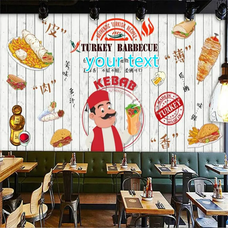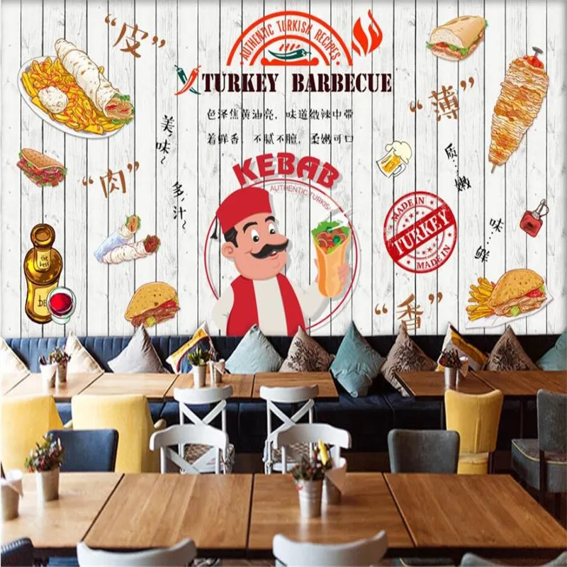 Пользовательские размеры Турция барбекю гриль белая деревянная доска фон настенная бумага 3D фаст-фуд Ресторан кебаб бар настенная бумага 3D