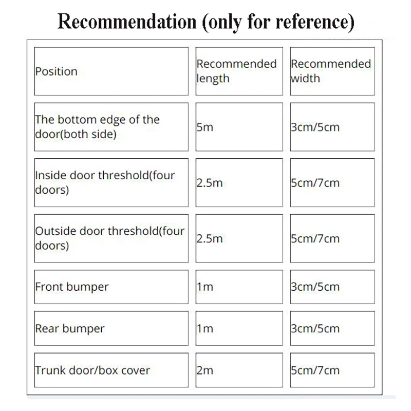 Положение Рекомендуемая длина Рекомендуемая ширина Нижняя часть двери (с обеих сторон) 5 м 3 см/5 см Внутренний порог двери (четыре двери) 2,5 м 5 см/7 см Порог наружной двери (четыре двери) 2,5 м 5 см/7 см Передний бампер 1 м 3 см/5 см Задний бампер 1 м 3 см/5 см Крышка двери багажника/коробки 2 м 5 см/7 см