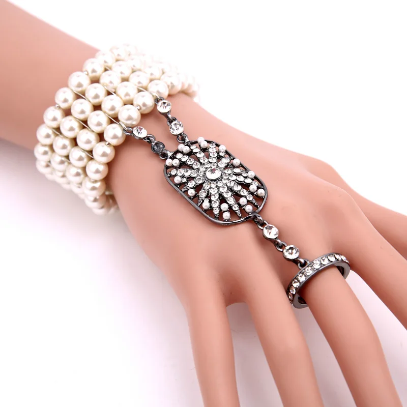 Арт-деко Великий Гэтсби Вдохновленный цветок браслет из искусственного жемчуга набор колец, свадебный браслет.