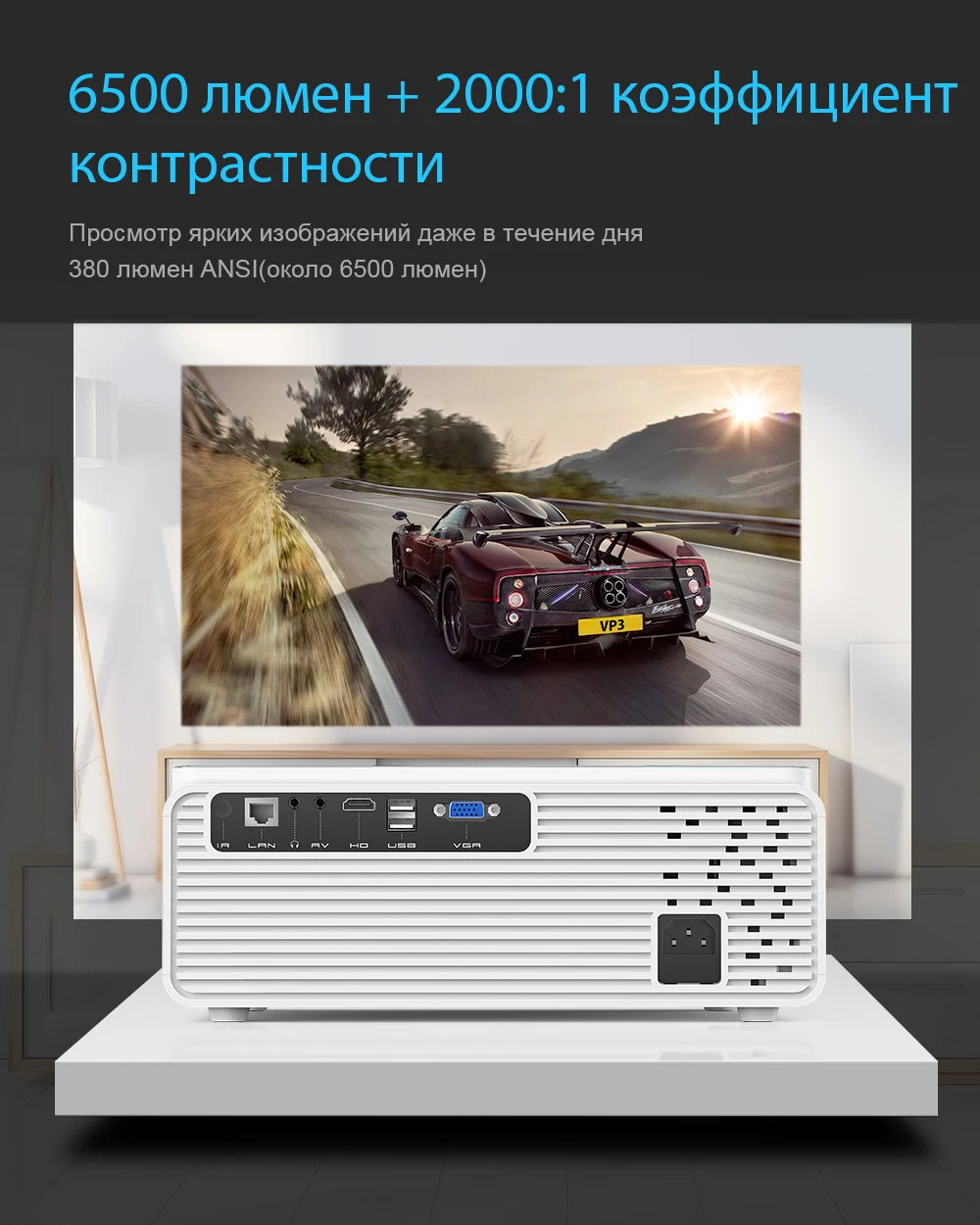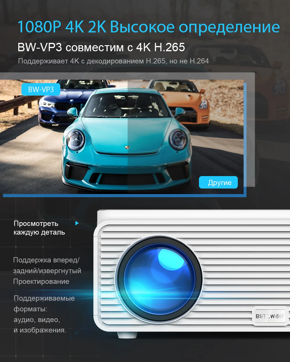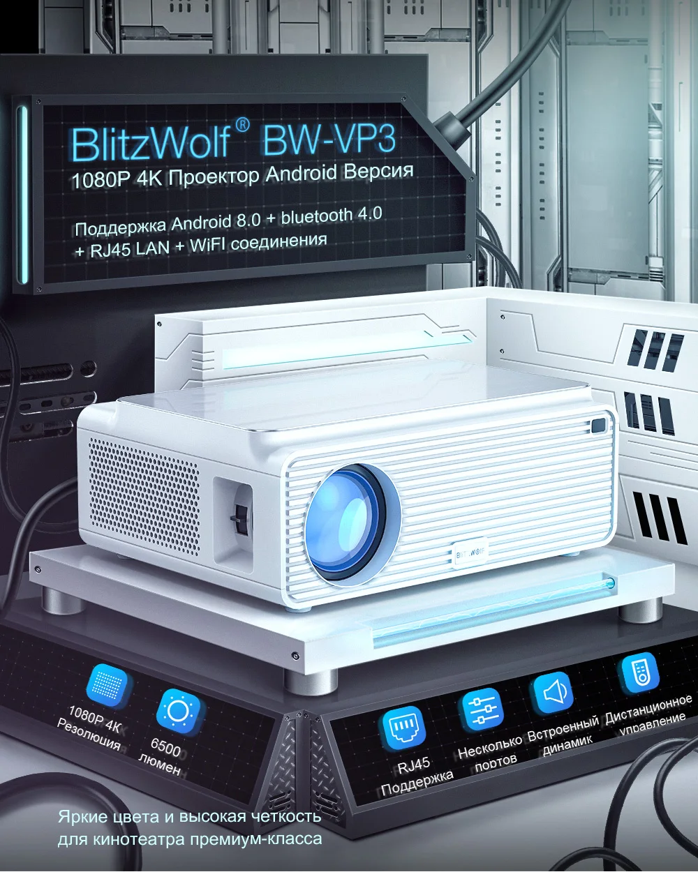 ЖК-проектор Blitzwolf BW-VP3, 380 ANSI 6500 люмен Android 8,0 16 Гб bluetooth, 4K разрешение, Система домашнего кинотеатра