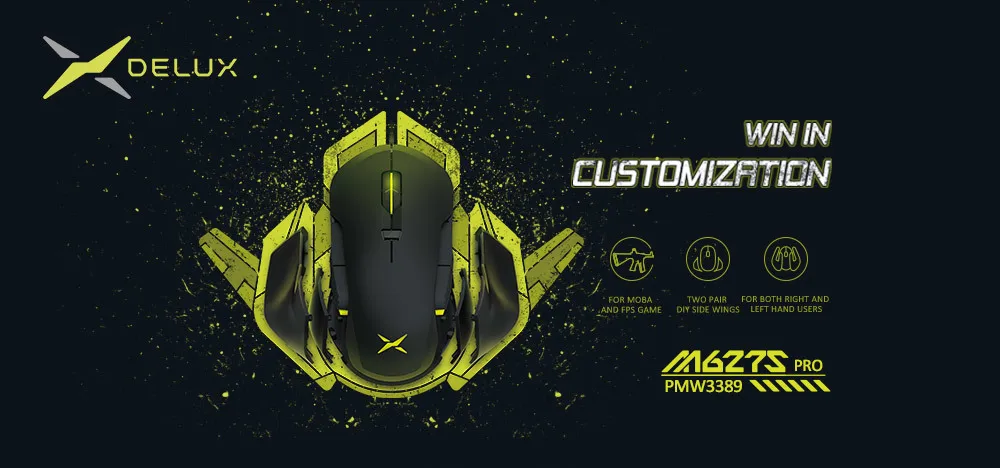 Проводная игровая мышь Delux M627S PMW3389, сенсор, 8 кнопок, 16000 точекдюйм, RGB подсветка, оптическая мышь для левой и правой руки сделай сам, боковые крылья