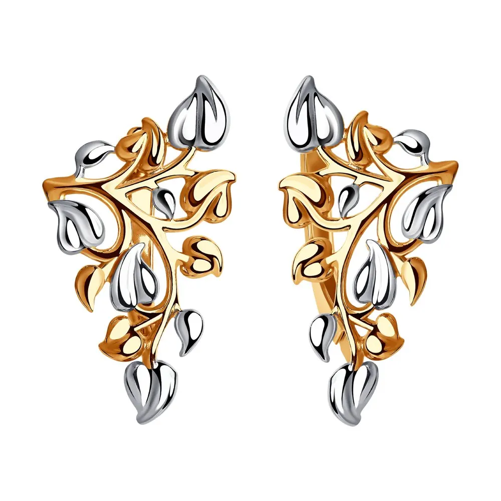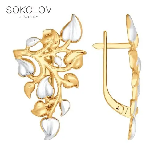 Позолоченные серьги SOKOLOV из серебраПозолоченные серьги из серебра соединили в себе сразу несколько актуальных дизайнерских решений. Сочетание двух оттенков металла делает композицию объёмной, а популярные в этом сезоне растительные мотивы придают форме изящество и нежность. Эффектное дополнение офисных, романтичных и вечерних образов.