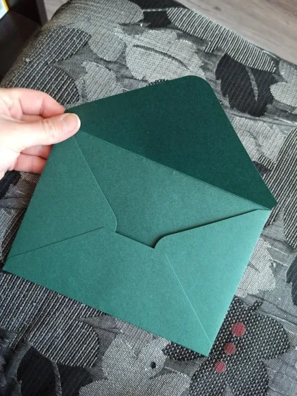 Конверты действительно красивые и очень высокого качества. Доставили престиссимо и упаковали идеально. К сожалению, на картинке цвет выглядит как зеленое масло/бирюзовый, хотя на самом деле это простой темно-зеленый, у меня был выбор, прикрепленный к одному, грех