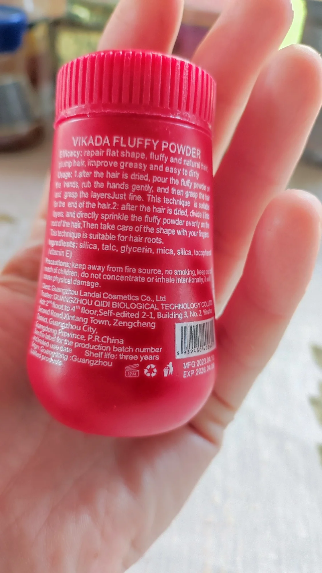 Баночка маленькая, там всего 10 г продукта. На фото видно, что заполнена не до конца. За это звезду снимаю. Сухой шампунь в виде беленького порошочка, без запаха. В Беларусь шел 2 месяца. Отзывы на него были неплохие, да и цена была до 1 доллара. Будем пробовать.
