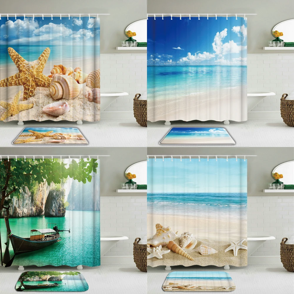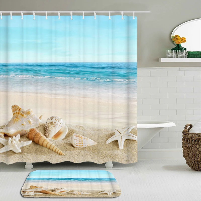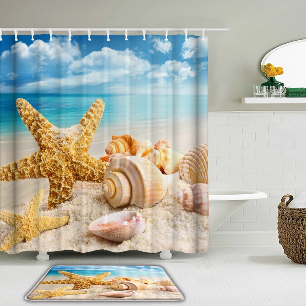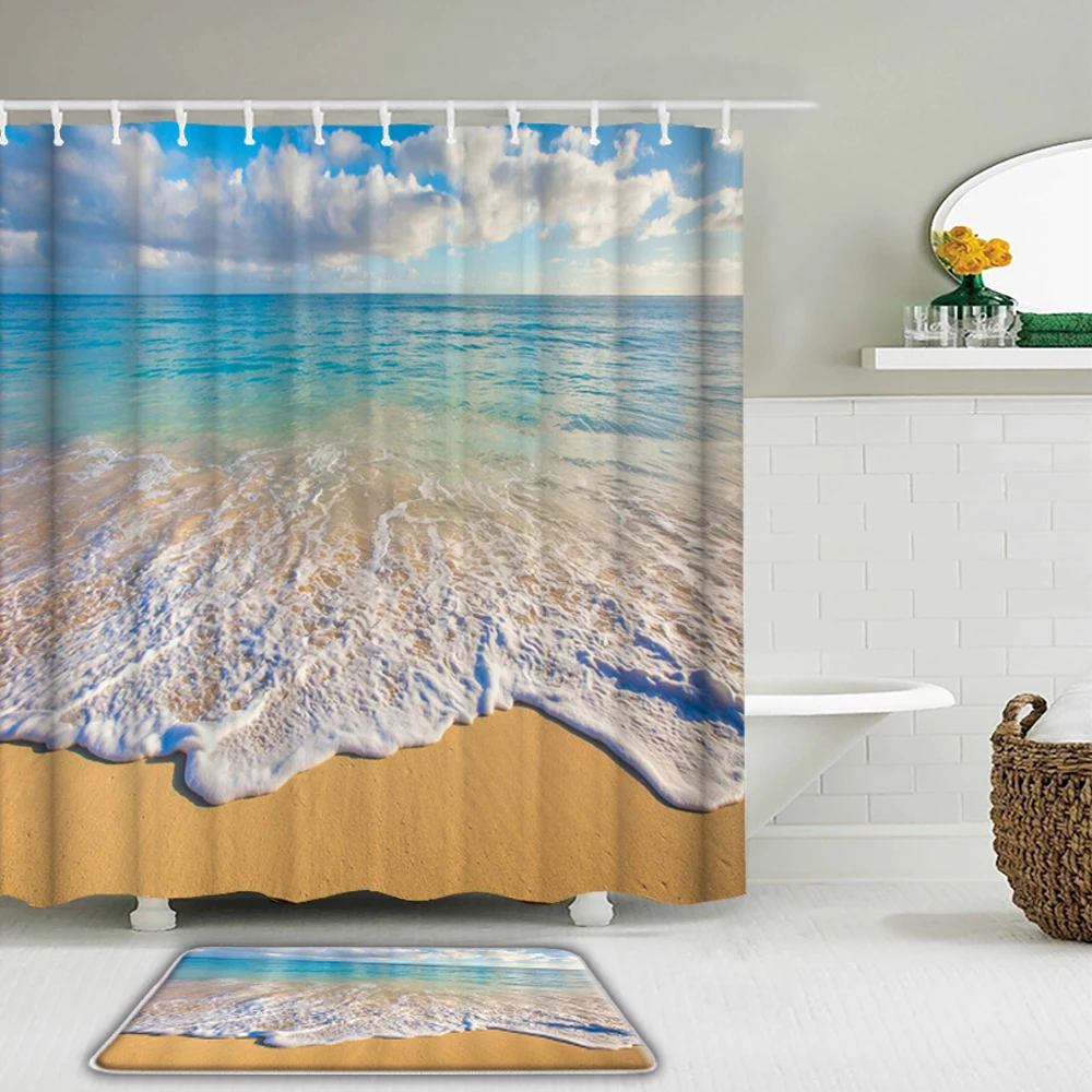 Океанский пляжный узор, полиэстер, водонепроницаемая занавеска для душа с прямоугольным нескользящим напольным ковриком, набор для ванной занавески
