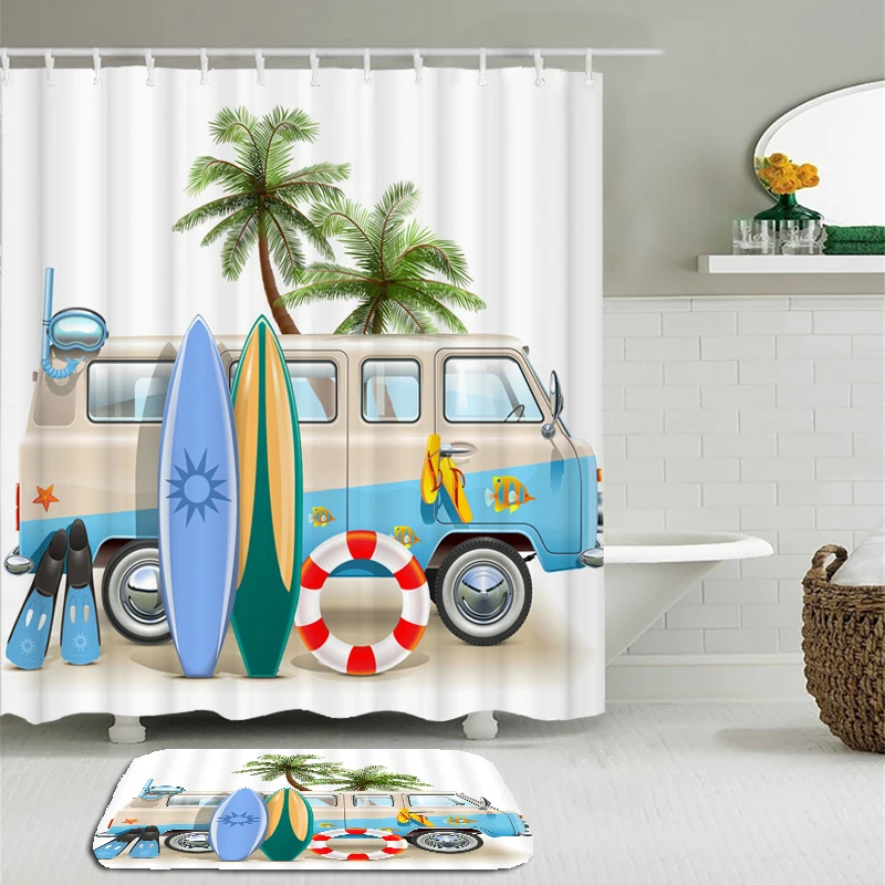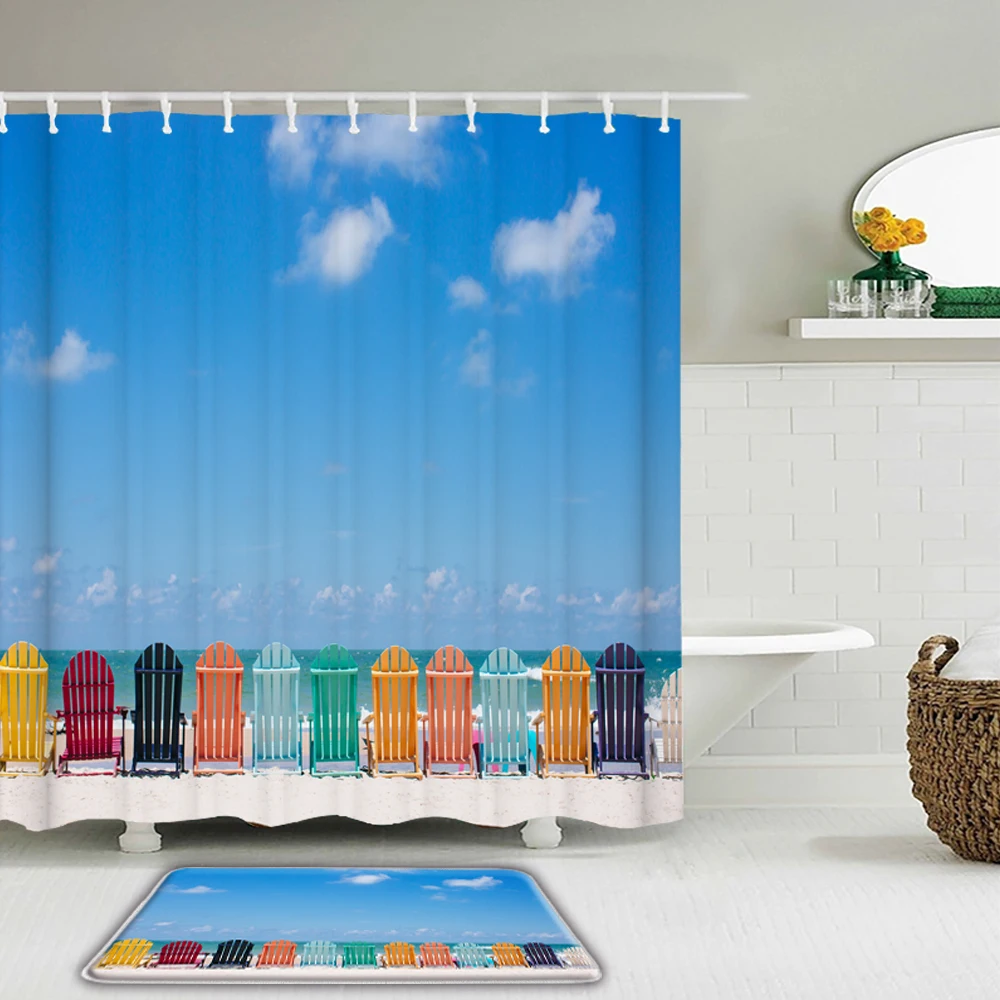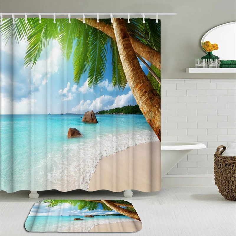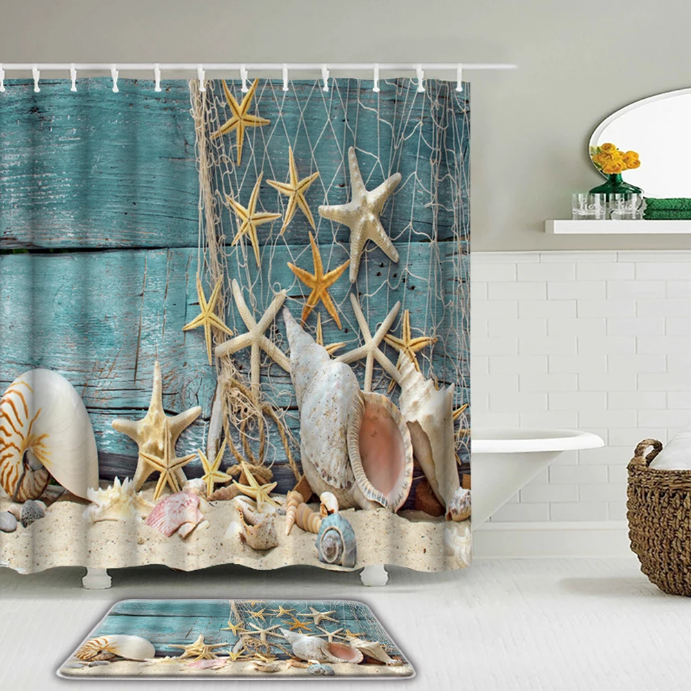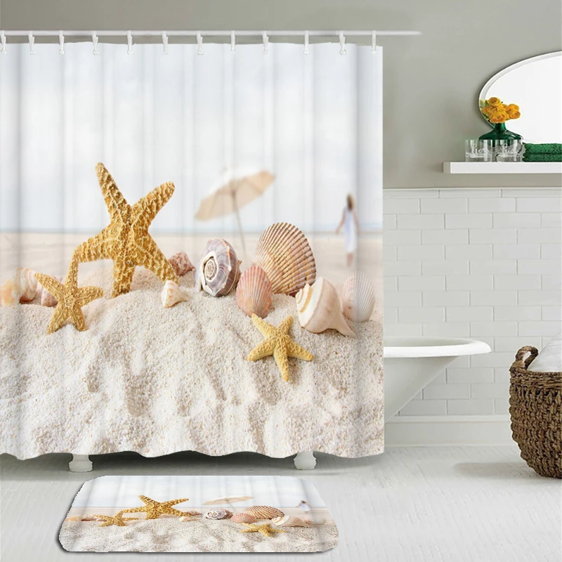 Океанский пляжный узор, полиэстер, водонепроницаемая занавеска для душа с прямоугольным нескользящим напольным ковриком, набор для ванной занавески