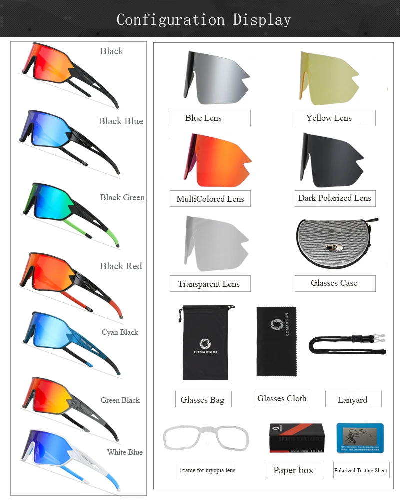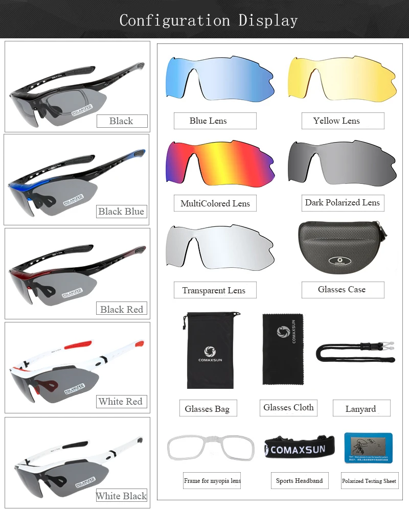 Материал: Поликарбонат (линза), PMCT (оправа)Посылка входит:1 Чехол для очковСумка для очков 1 шт.1 салфетка для очков1 оправа для очков5 различных глубин цветовых линз легко меняются1 оправа для линз при близорукости (всего одна пара темных линз поляризована)1 поляризованный тестовый лист