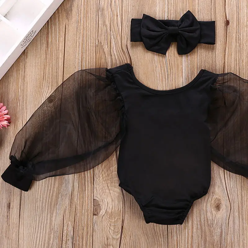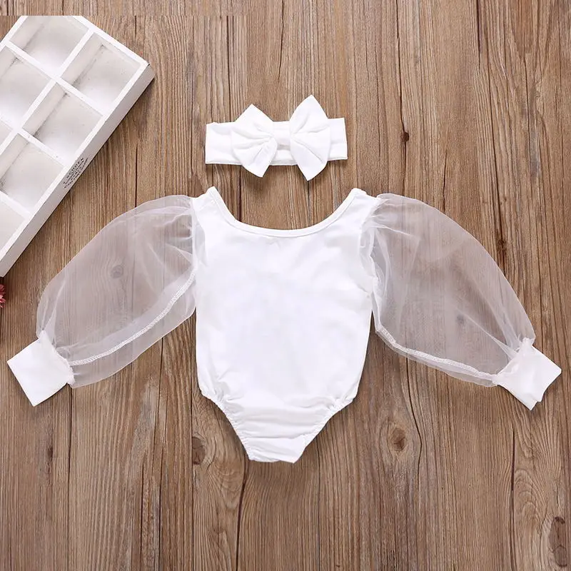 Комбинезон для новорожденных девочек, кружевной сетчатый комбинезон с пышными длинными рукавами, повязка на голову, однотонная одежда, 2 шт., лето 2020