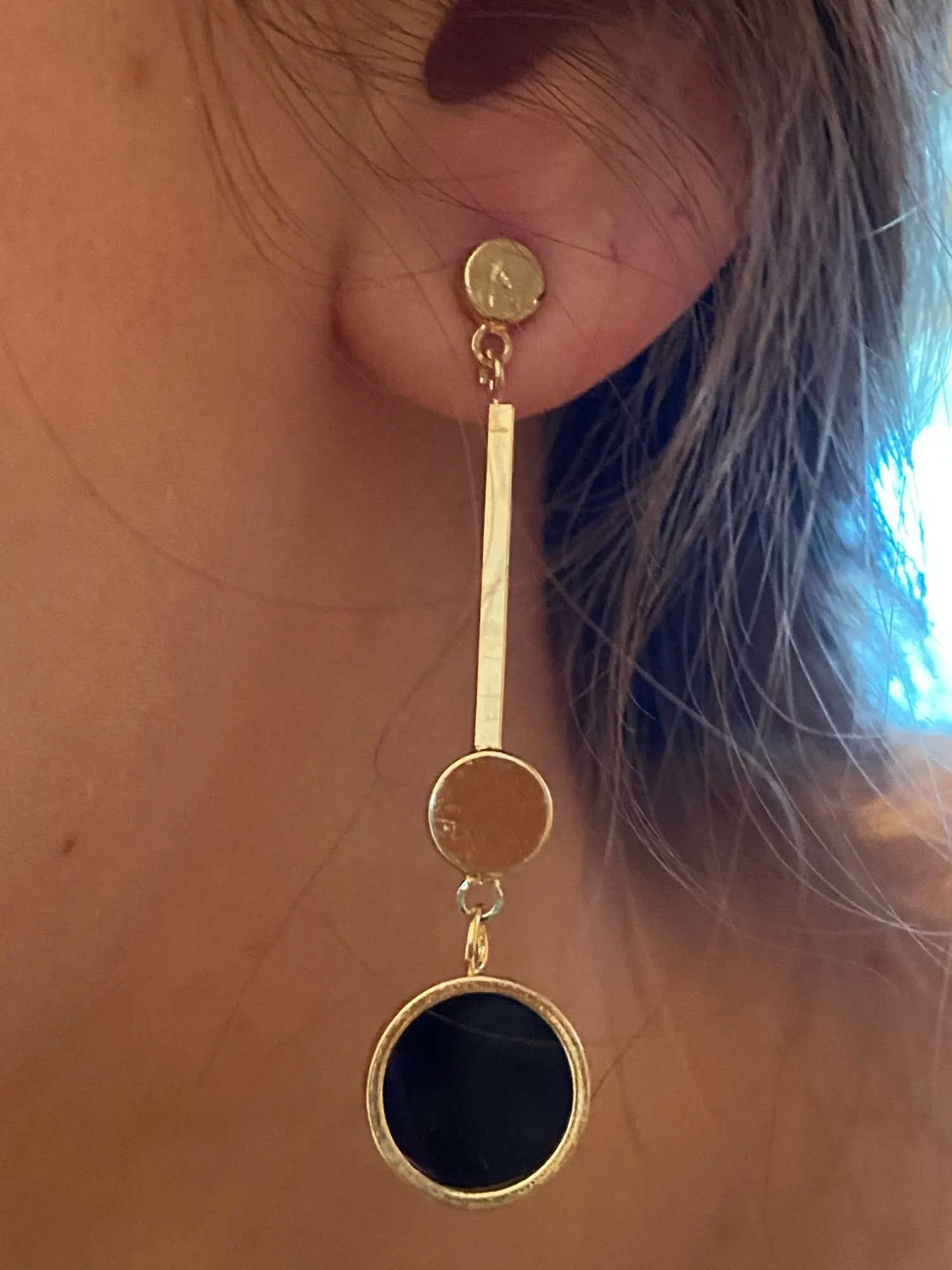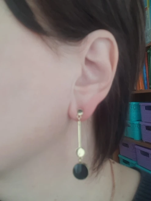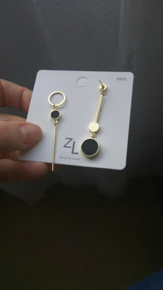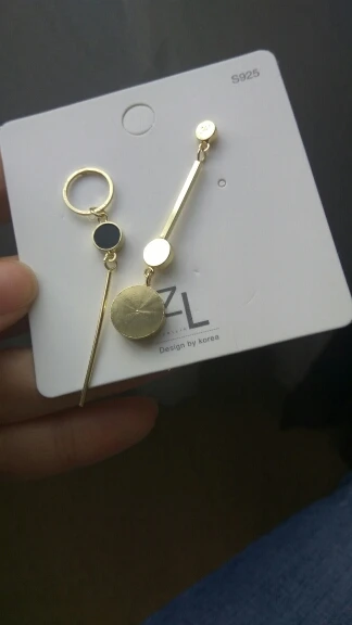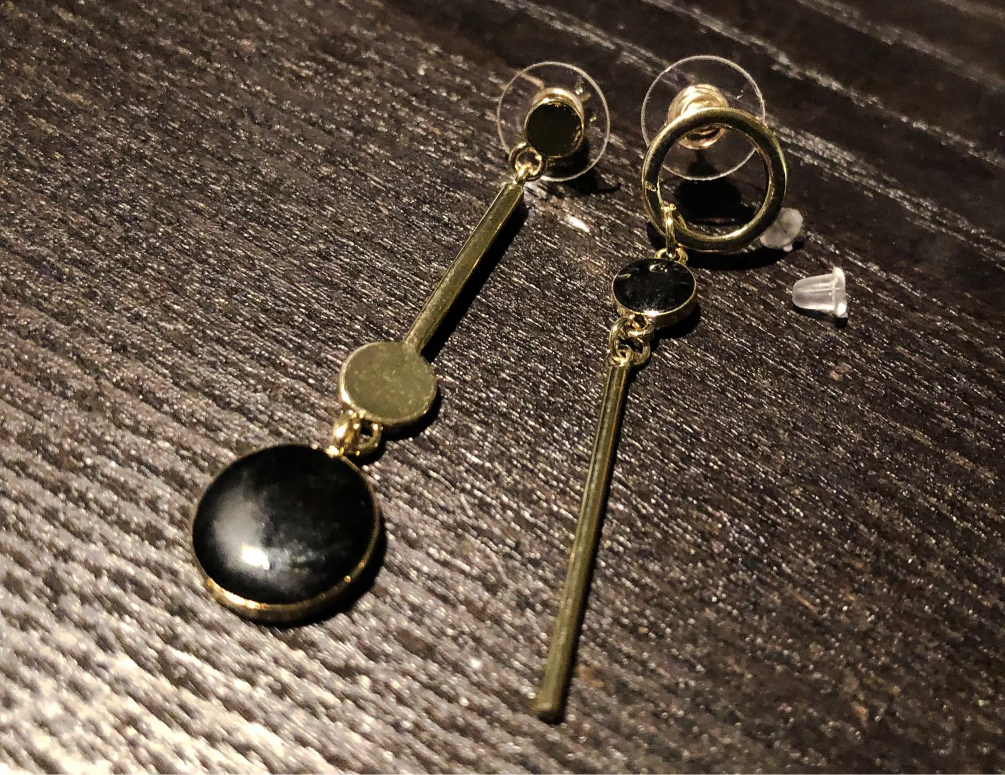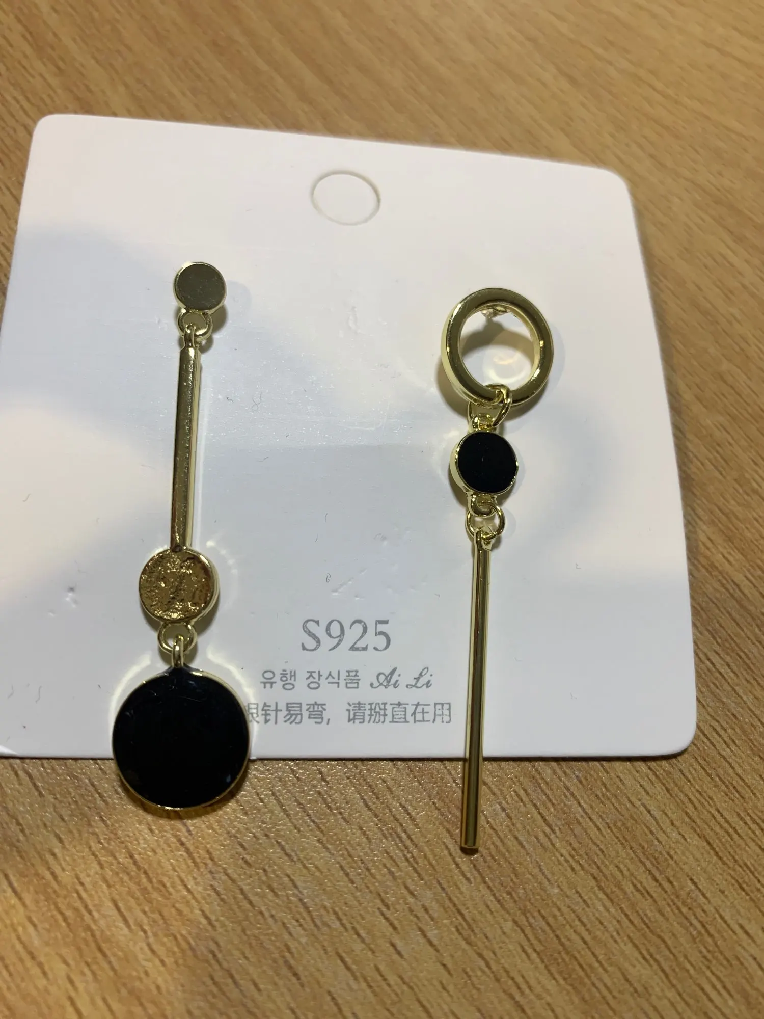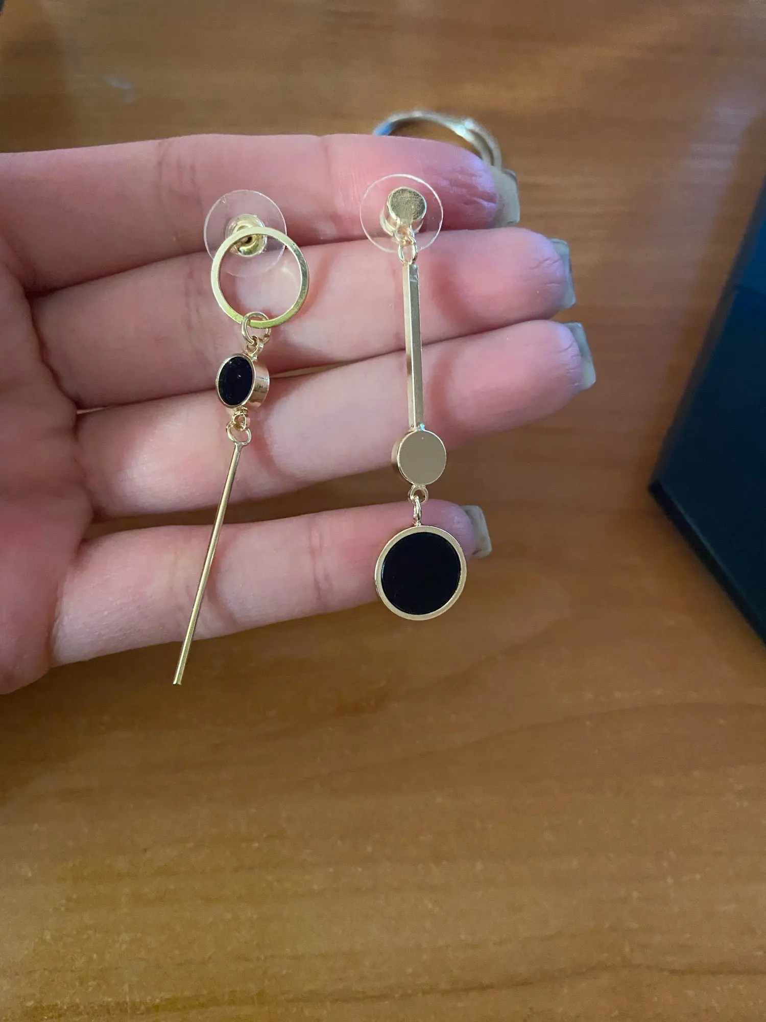 Аккуратные серьги. Блестящие. Та, у которой чёрный круг внизу, тяжелее. В комплекте запасные резиновые держатели.