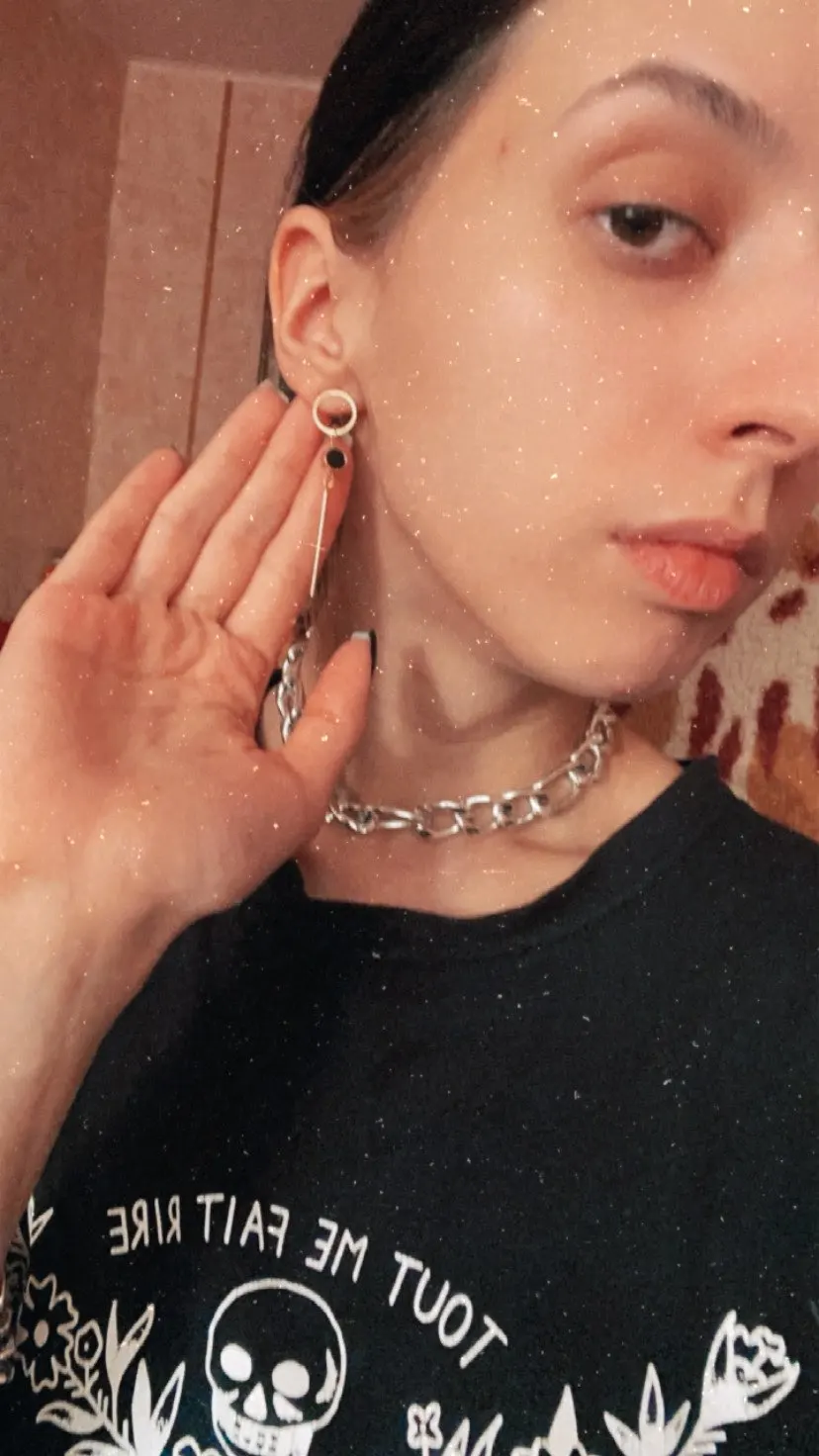 Серьги соответствуют своей цене. Так7 себе. Но ничего, носить можно. Продавец положил запасные заклёпки.А вот цепочка на детскую руку, а заявлено ожерелье на шею.