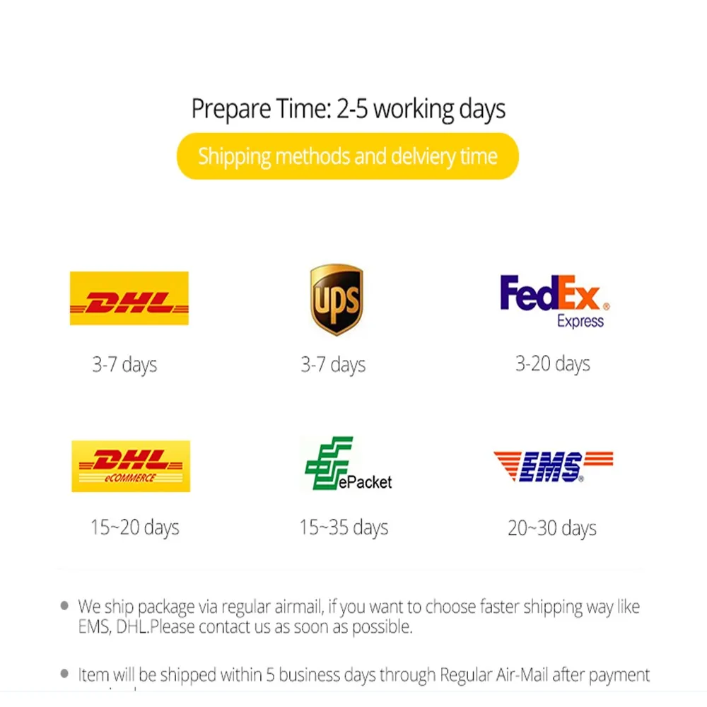 Мы тщательно проверим каждую деталь перед отправкой. Поскольку размер упаковки и другие причины, стоимость доставки не очень точная. Если вы хотите другой способ доставки (DHL \ UPS \ FedEx \ TNT. И т. Д.) пожалуйста, свяжитесь с нами, мы дадим вам лучшую цену!