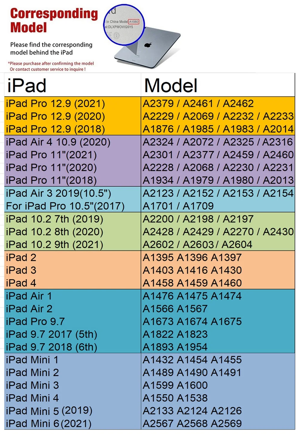5. Для iPad Pro 10,5 2017 ( A1701 A1709)Нельзя использовать для других моделей планшетов.Перед размещением заказа, пожалуйста, внимательно проверьте модели ваших планшетов, как показано ниже.Когда вы размещаете заказ, убедитесь, что ваш адрес на 100% правильный, особенно русские друзья, пожалуйста, оставьте свое полное имя, в противном случае мы не несем ответственности за сбой доставки!