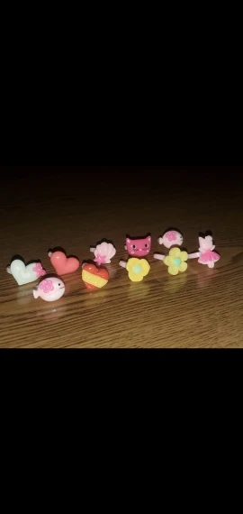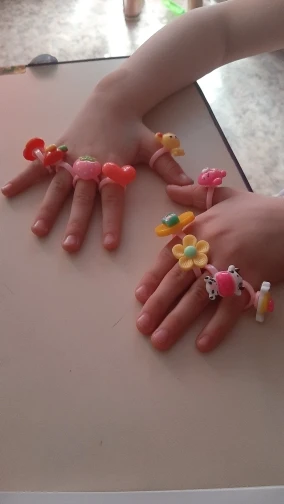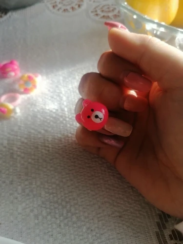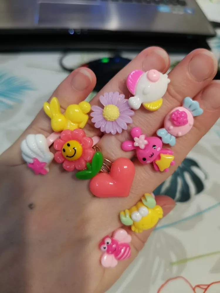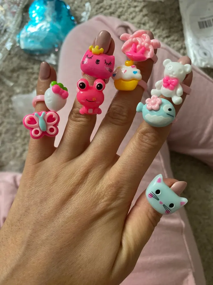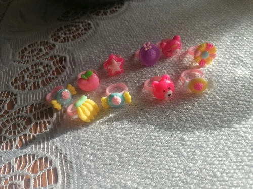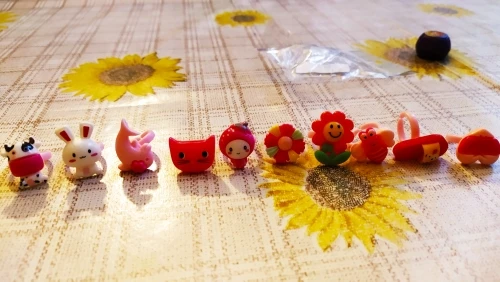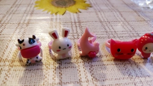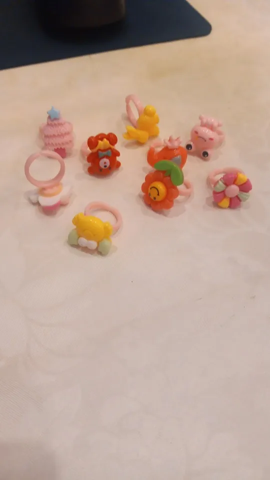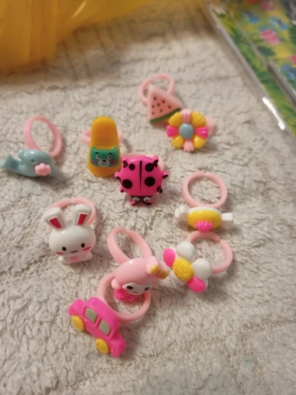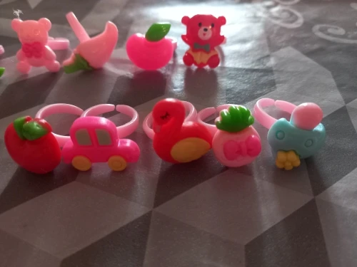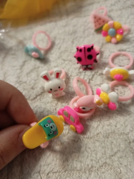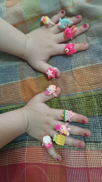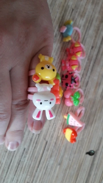 Кольца приходят рандомные, наши не совпали с картинкой продавца, но в основном миленькие. Одно кольцо (кот) страшненькое, такое ощущение, что его забыли покрасить. В остальном хорошие детские колечки. Но ооочень долгая доставка. Уже хотела открывать спор, но всё-таки товар пришёл