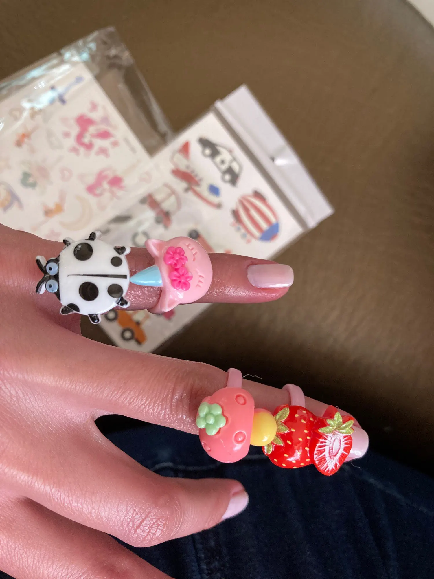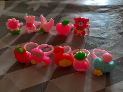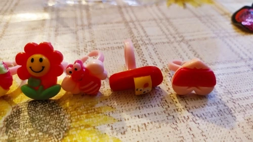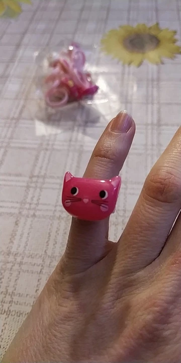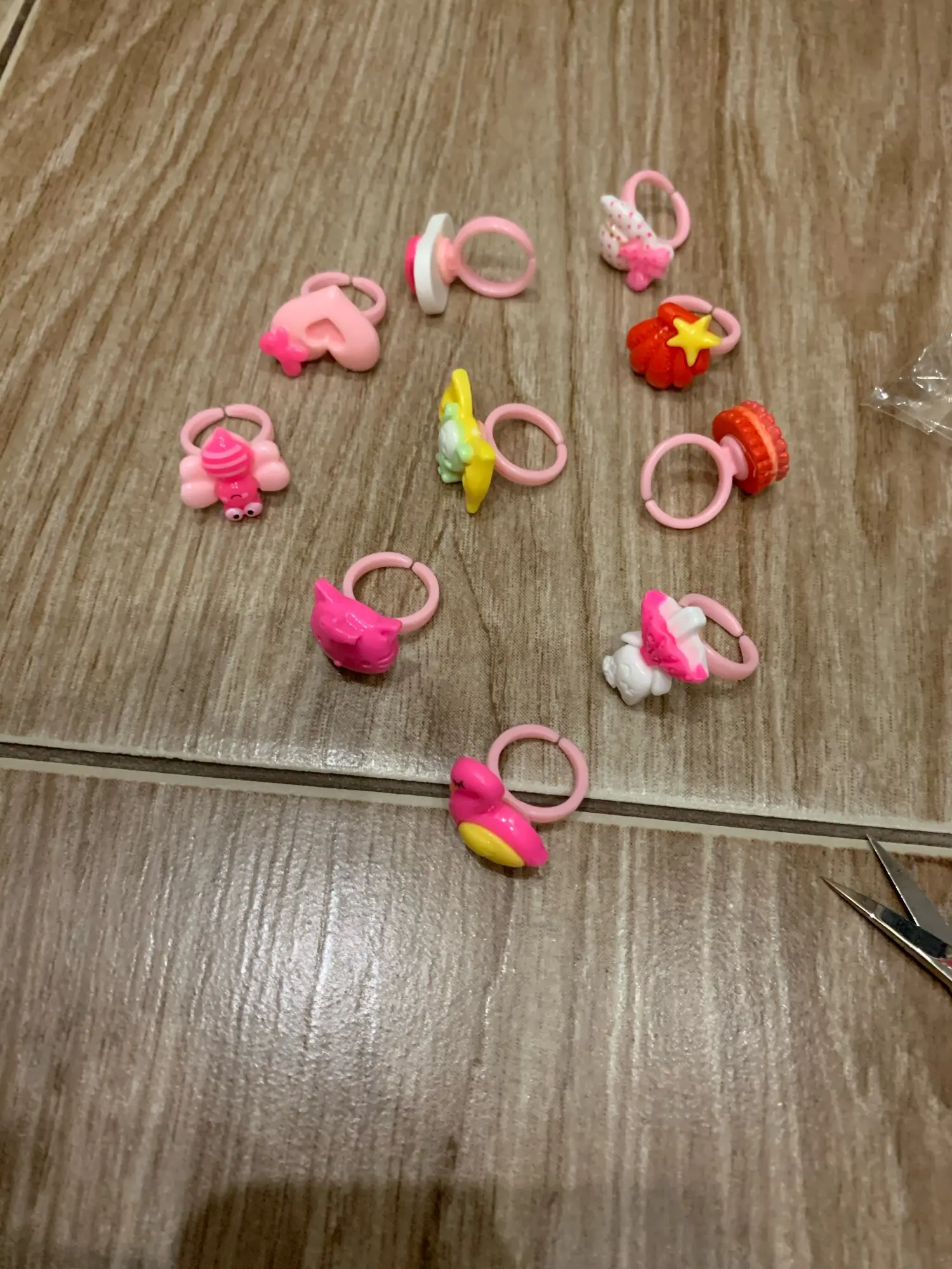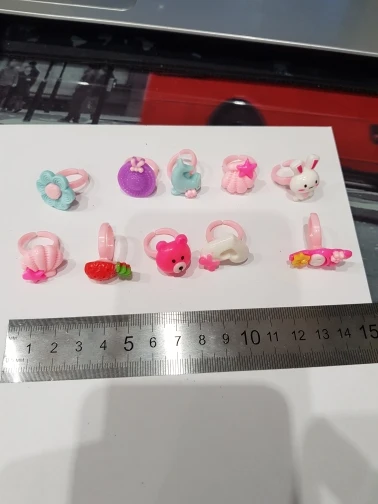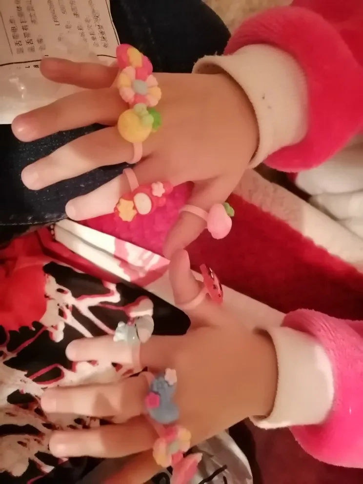 Кольца приходят рандомные, наши не совпали с картинкой продавца, но в основном миленькие. Одно кольцо (кот) страшненькое, такое ощущение, что его забыли покрасить. В остальном хорошие детские колечки. Но ооочень долгая доставка. Уже хотела открывать спор, но всё-таки товар пришёл