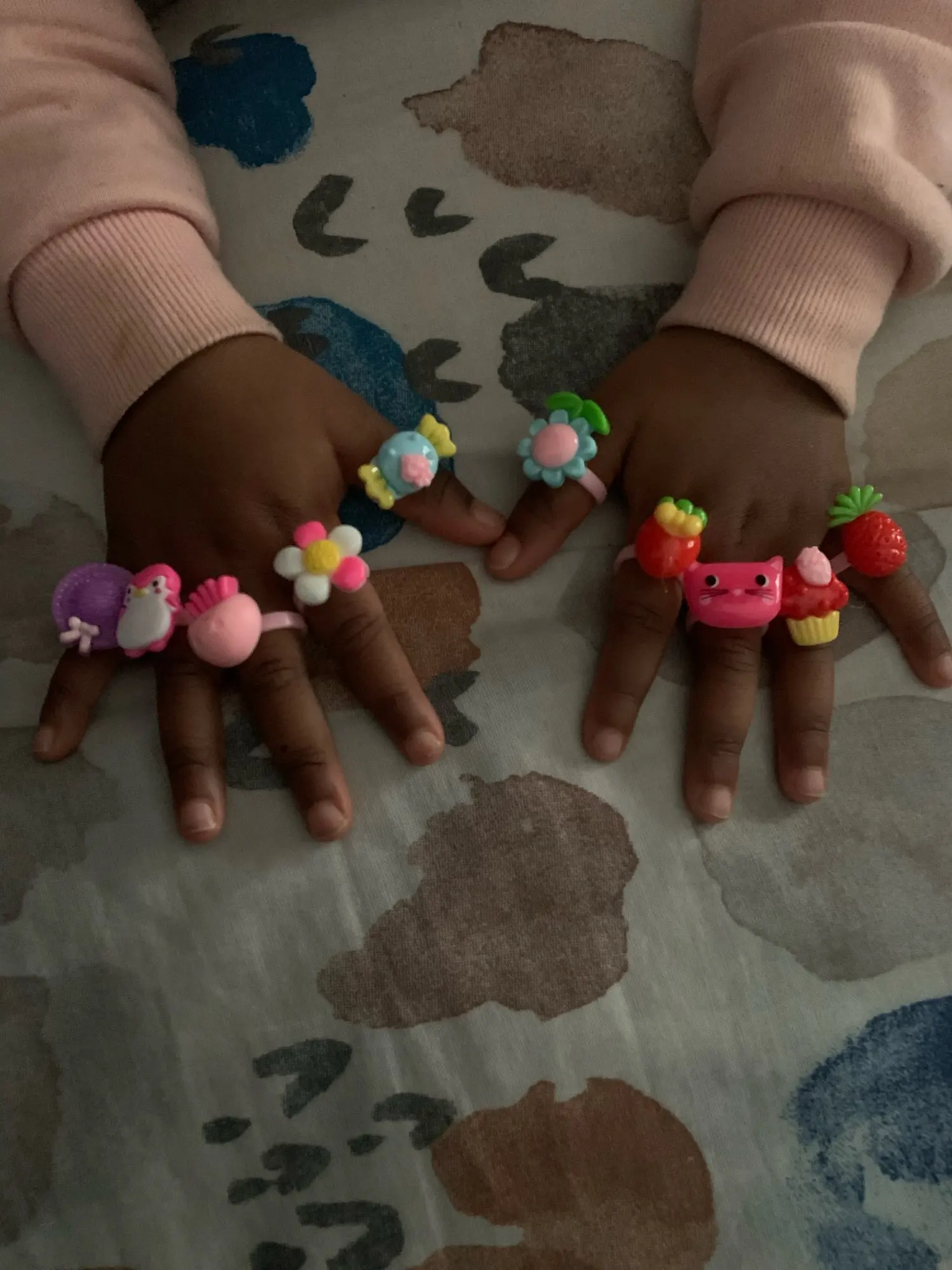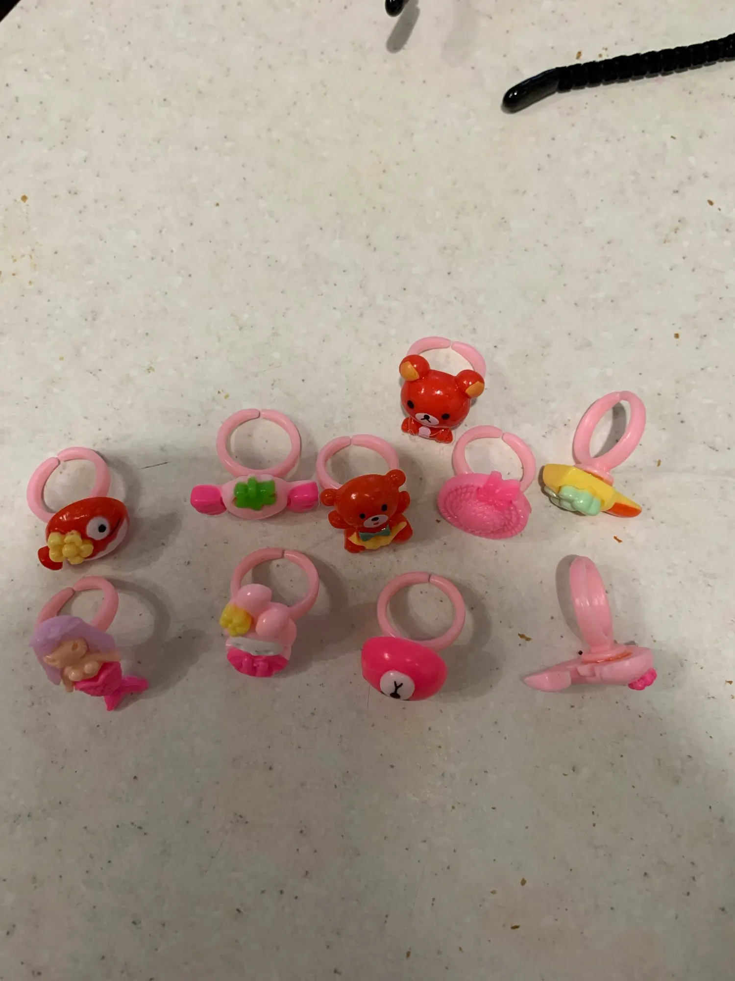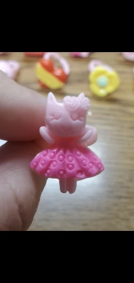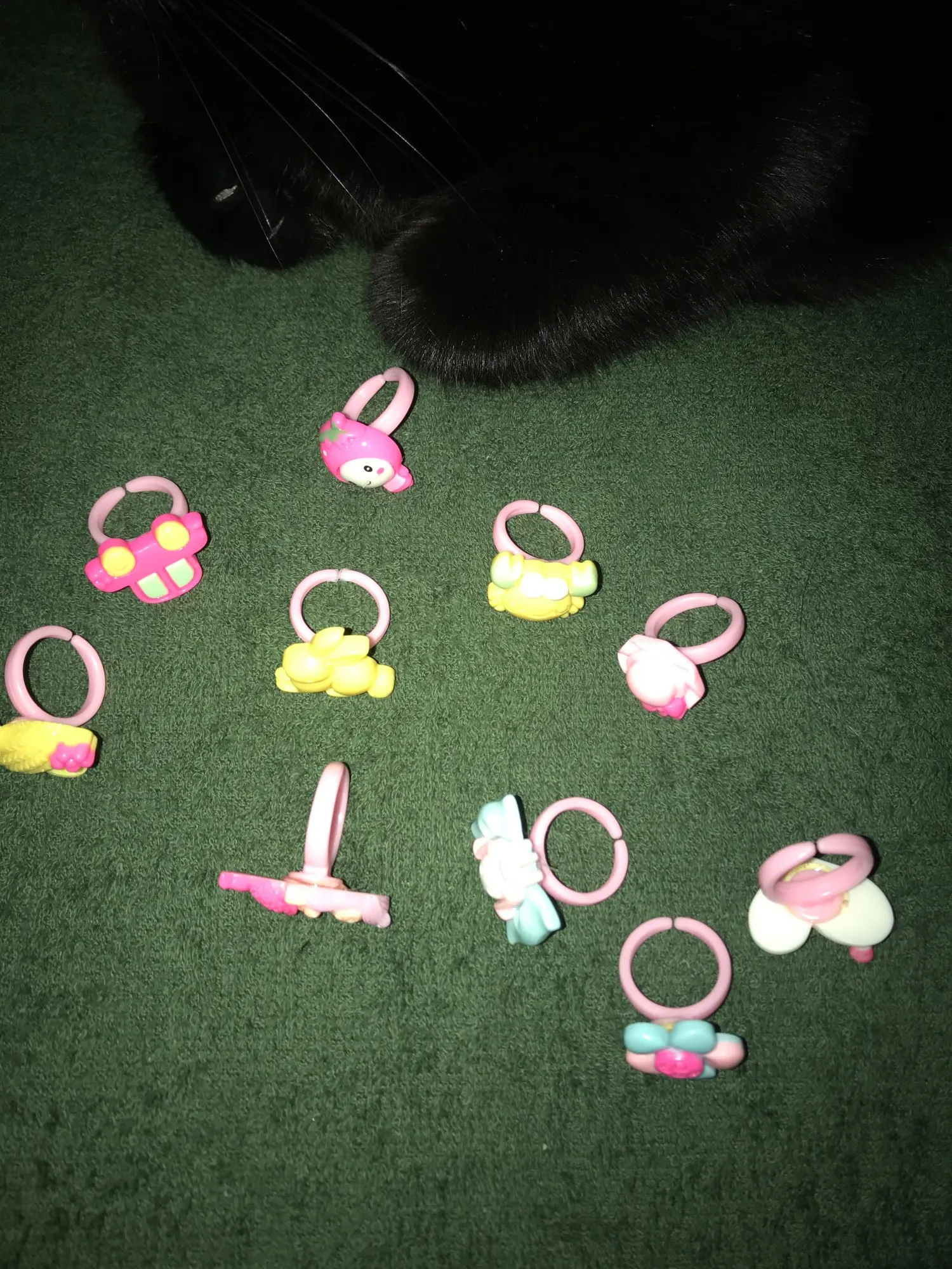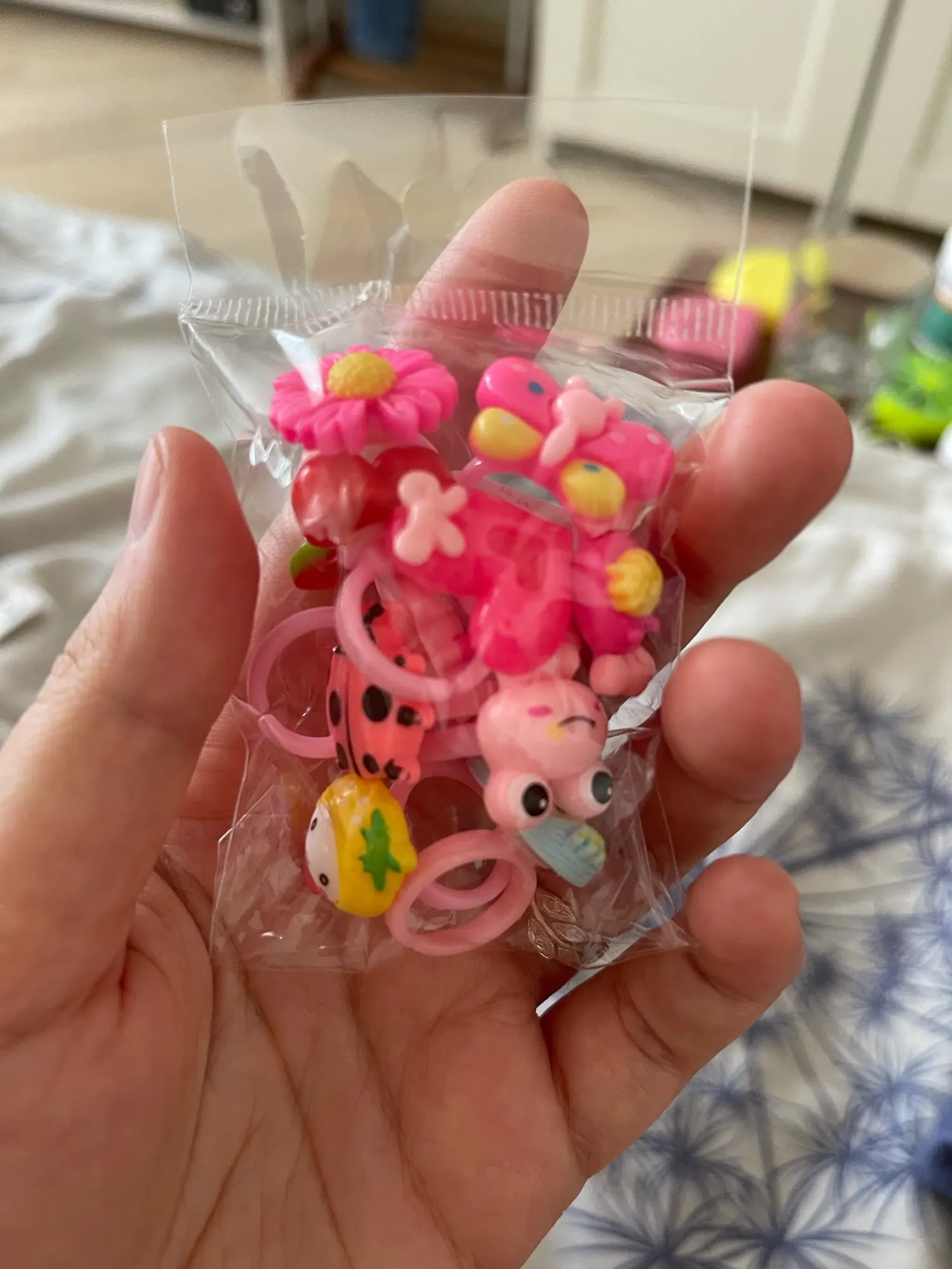 Кольца приходят рандомные, наши не совпали с картинкой продавца, но в основном миленькие. Одно кольцо (кот) страшненькое, такое ощущение, что его забыли покрасить. В остальном хорошие детские колечки. Но ооочень долгая доставка. Уже хотела открывать спор, но всё-таки товар пришёл