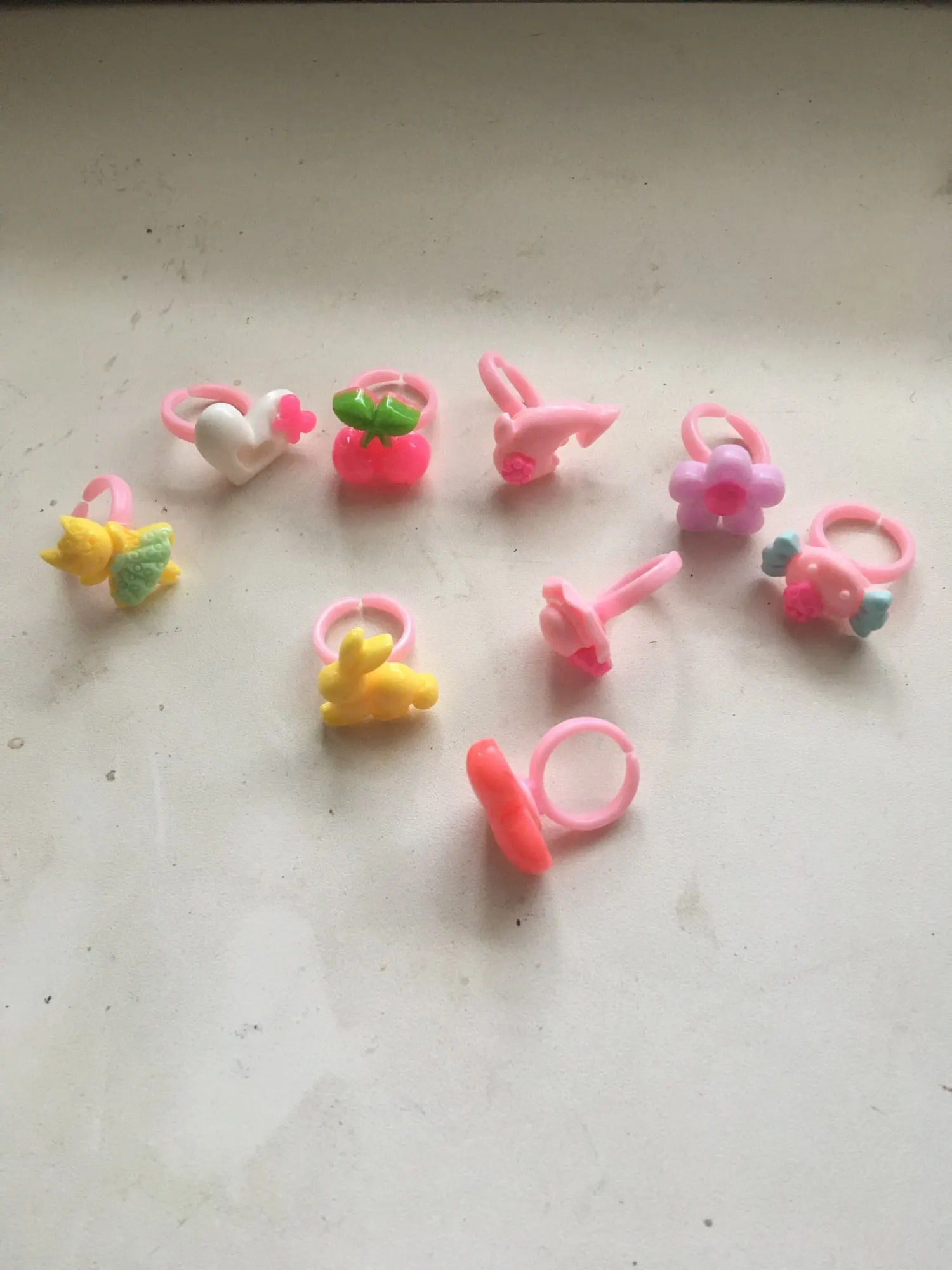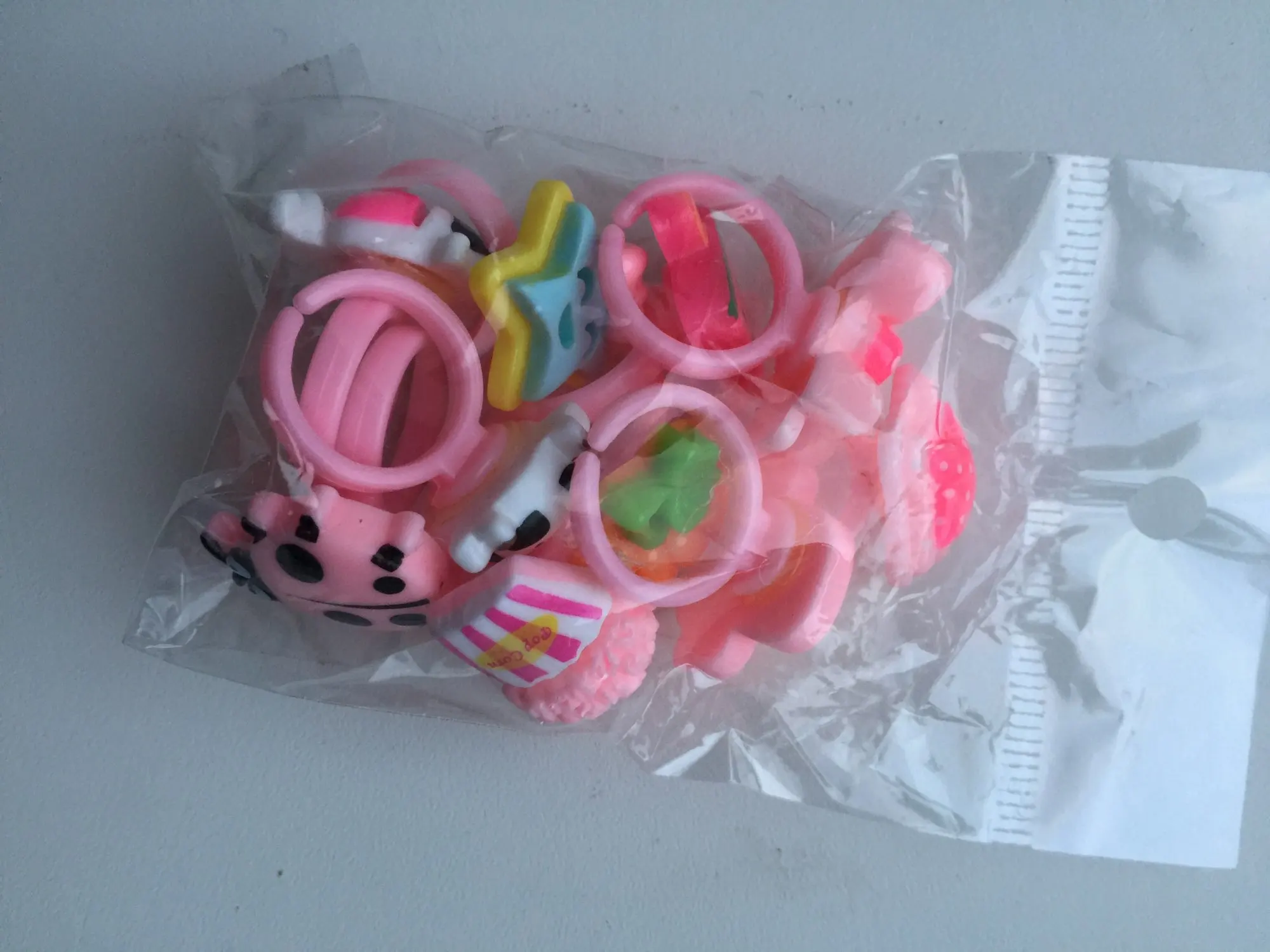 пластиковые колечки. ровно 10 штук. всё как в описании. пришли разных видов. дочке 3 года. она довольна