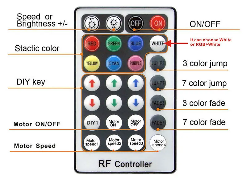 Характеристика -28 ключей RF пульт дистанционного управления -Светильник: цвет stati (смешанный белый, чистый белый, красный, зеленый, синий, желтый, светло-голубой, розовый + DIY цвет), прыжок, выцветание, четырехскоростное мерцание, контроль яркости, скорость режима, -Использование четырех лампочек RGBW, регулируемый белый светильник, наиболее подходящий для звезд -Лучшее рассеивание тепла и более стабильное -Безопасность, сам по себе не заряжен, не боится воды, может удовлетворить множество условий -Маленький размер, мягкий и гибкий, легко создать и сделать все, что вы хотите форму -Широко используется для украшения занавесок, экрана, потолка