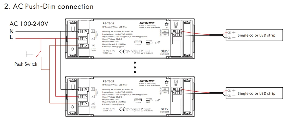 Если к одному и тому же нажатию подключен более одного светодиодный драйвера, Сделайте Длительное нажатие более 10 с, затем система синхронизируется, и все огни в группе тускнеют до 100%. Это означает, что нет необходимости в каких-либо дополнительных синхронных проводах в больших размерах Установки. Мы рекомендуем количество светодиодный-драйверов, подключенных к push-переключателю, не превышает 25 штук, максимальная длина проводов от push до светодиодный-драйвер должен быть не более 20 метров.
