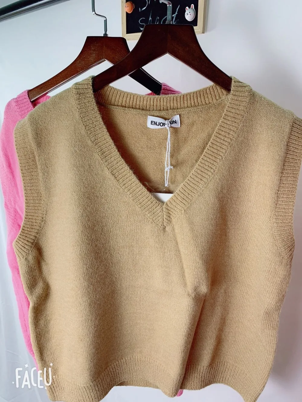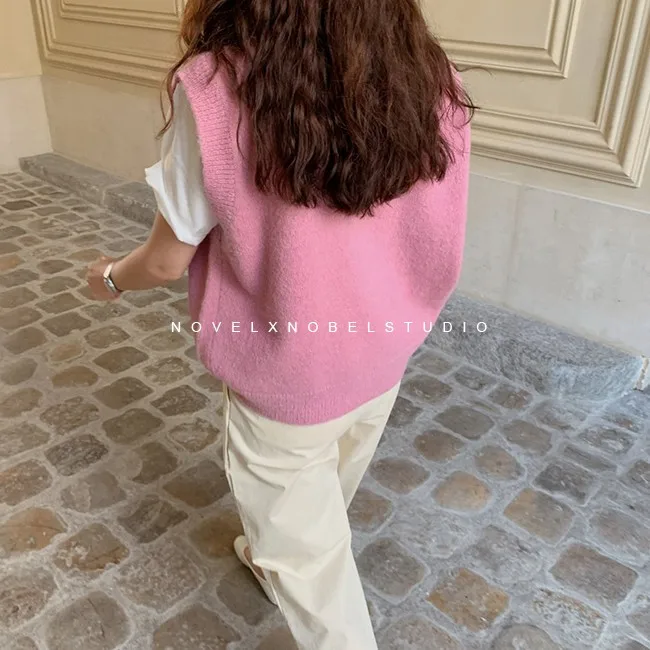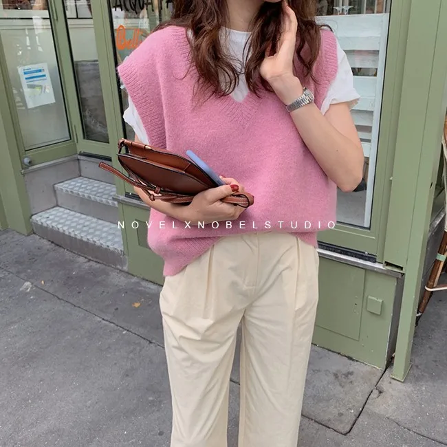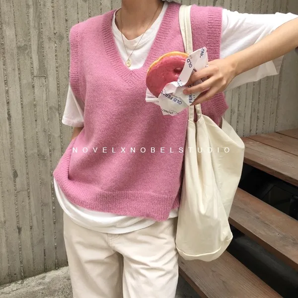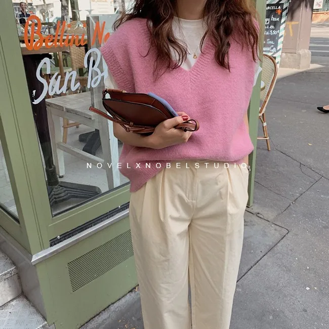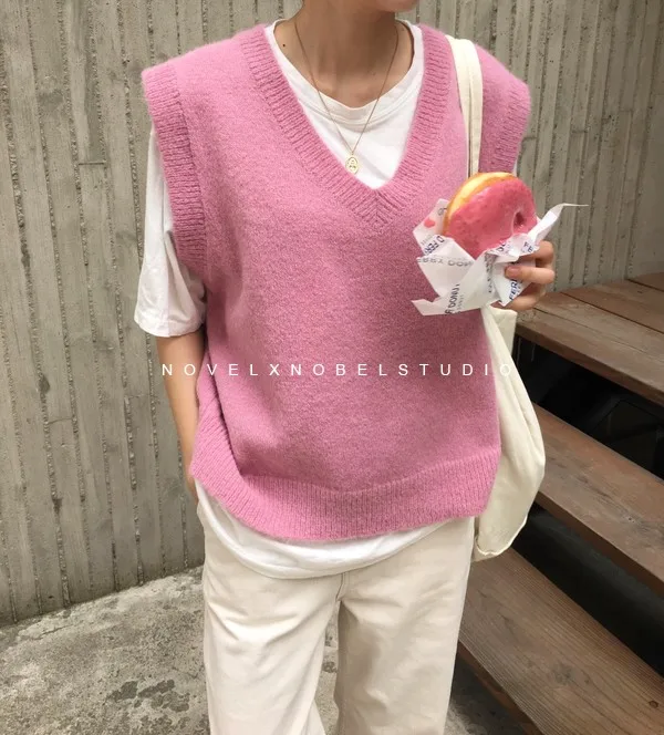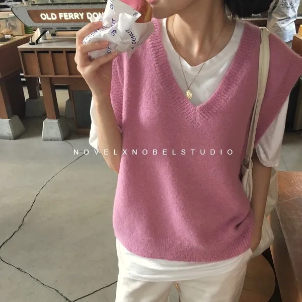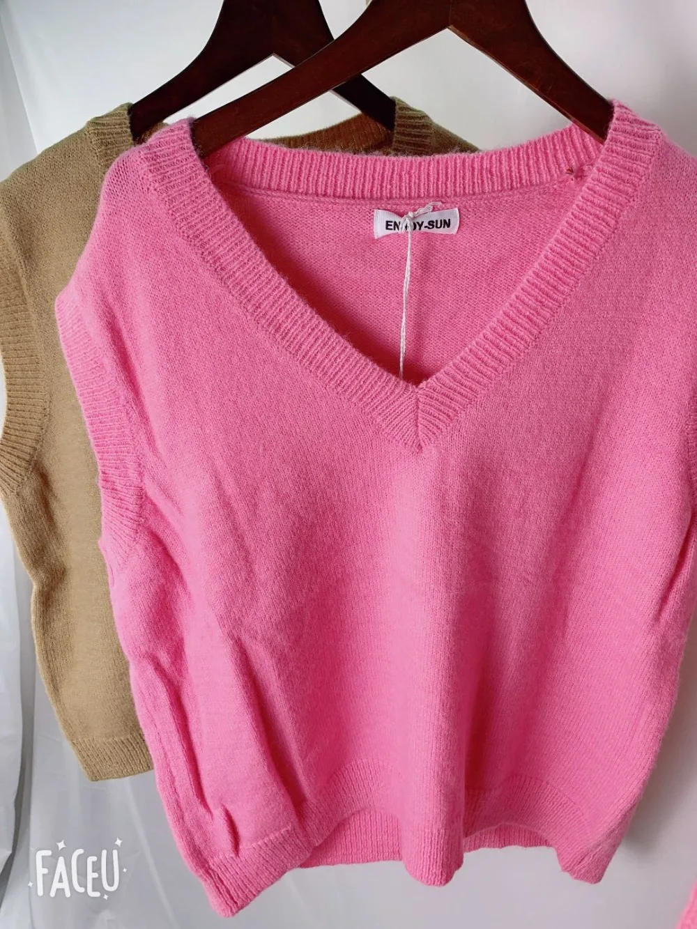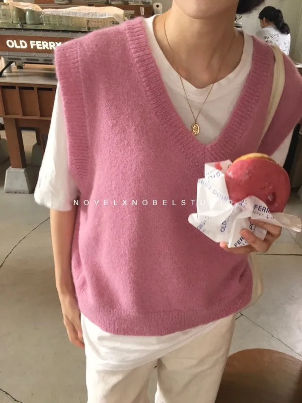 Женский трикотажный пуловер, розовый свитер без рукавов, с V-образным вырезом, Осень-зима