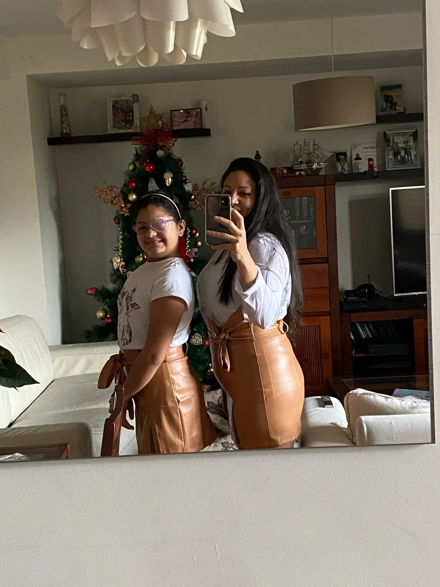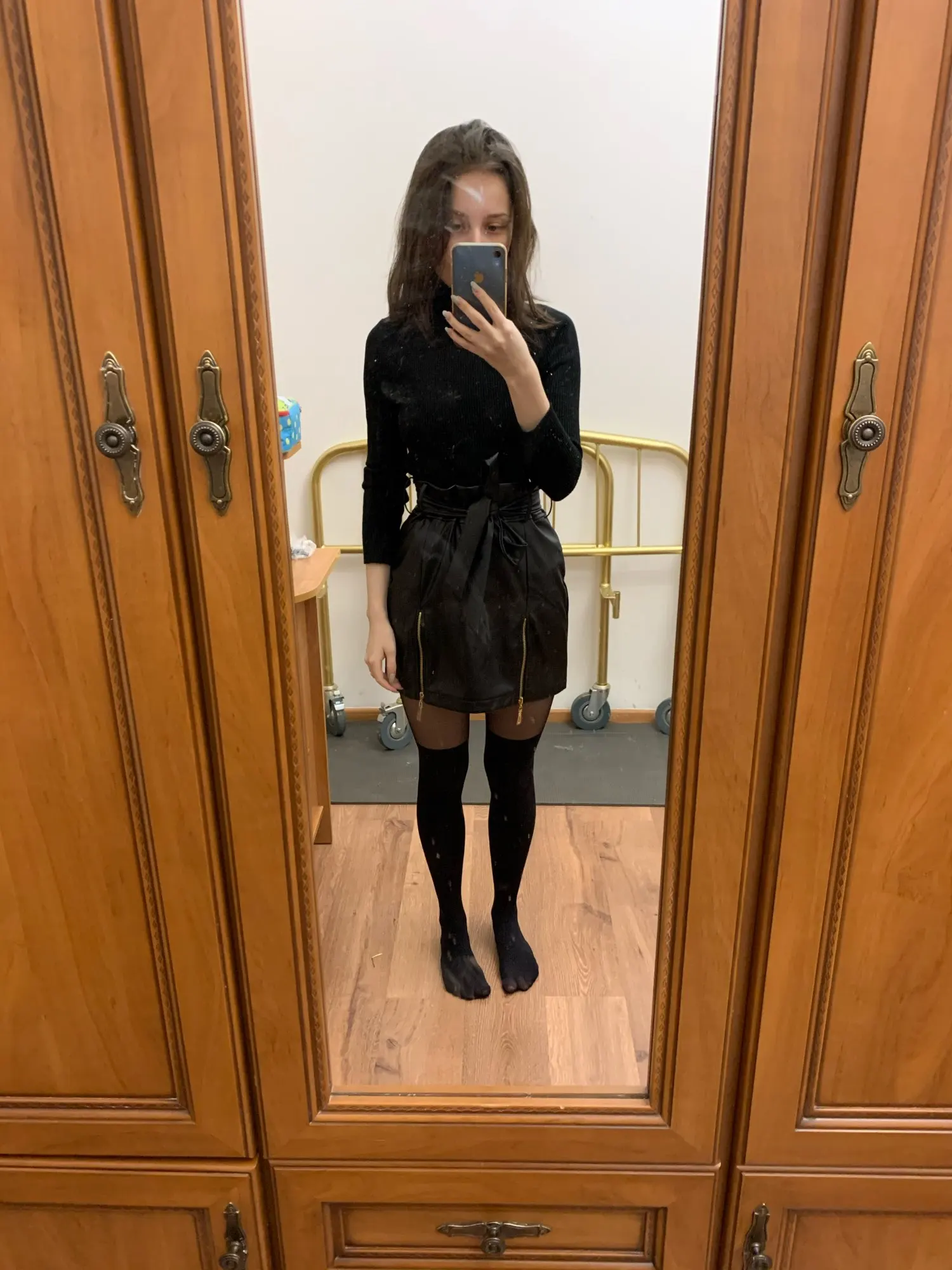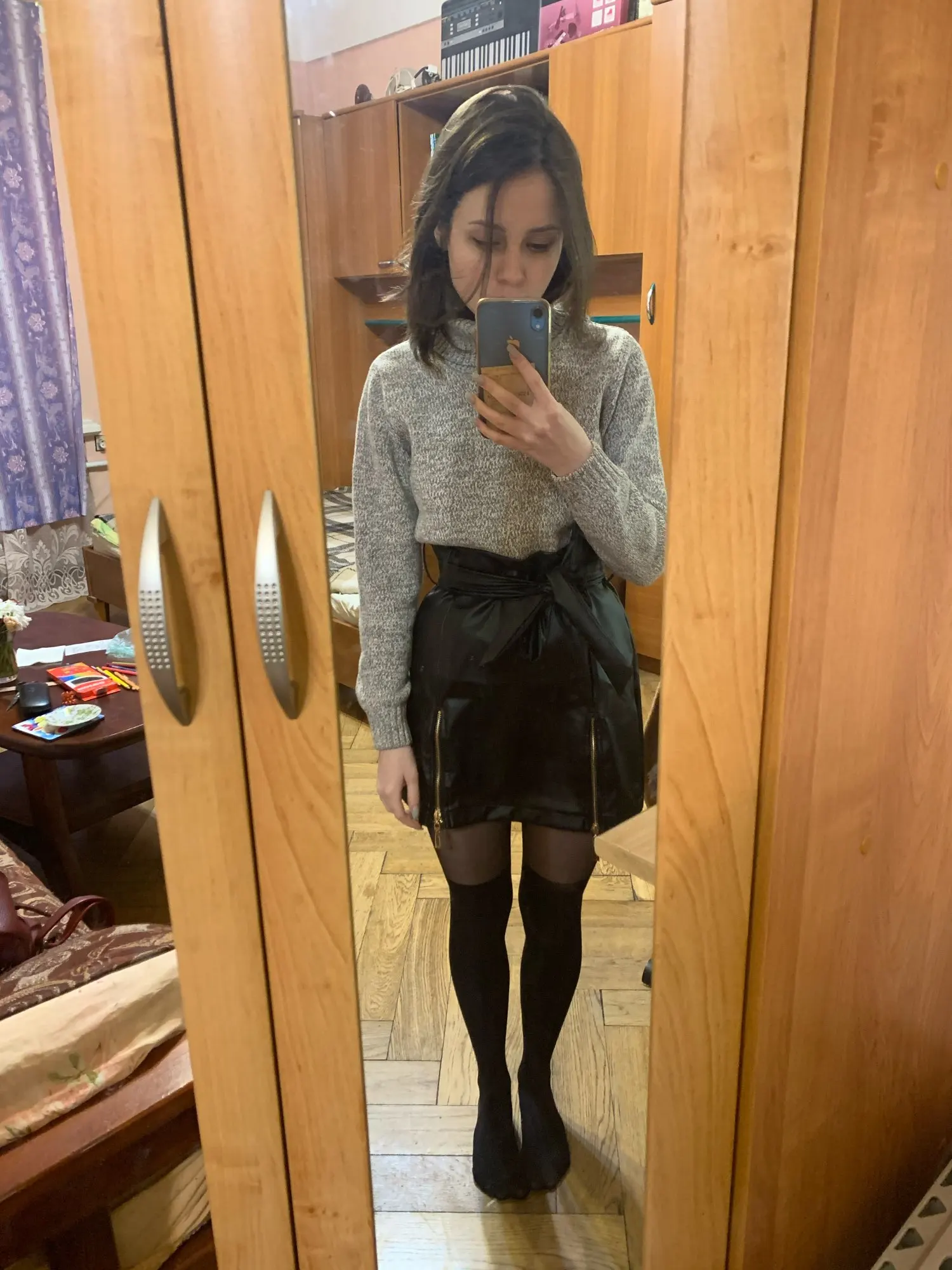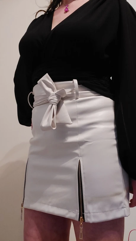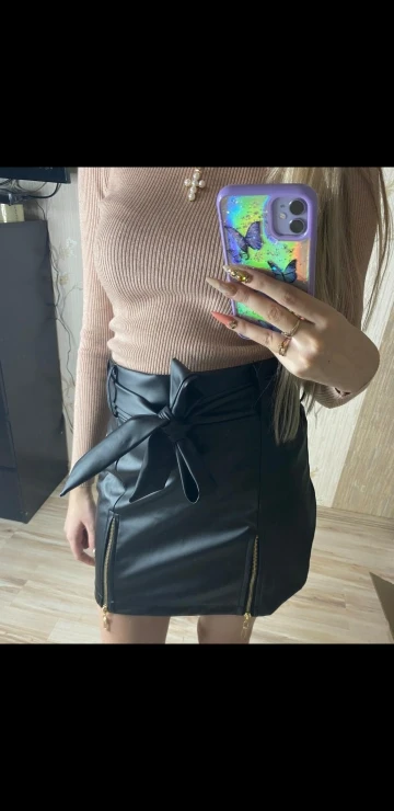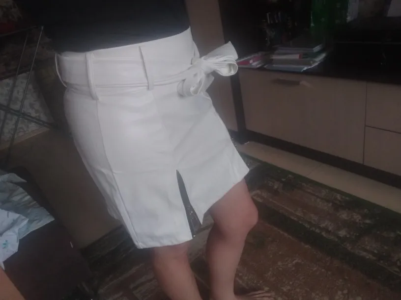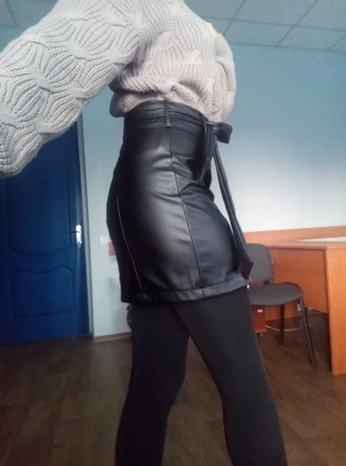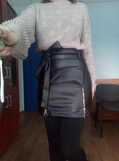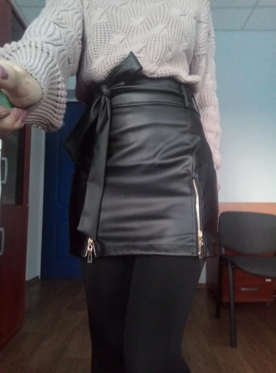 Юбка выполнена из хорошего кожзам. Кожзам довольно плотный, замочки свободно растёгиваются и застёгиваются. Сверху поясок, который можно завязать бантом или просто узлом. Мне очень понравилась, тем более за такую цену. Дошла быстро. Вот так выглядит на мне) Рекомендую к покупке!