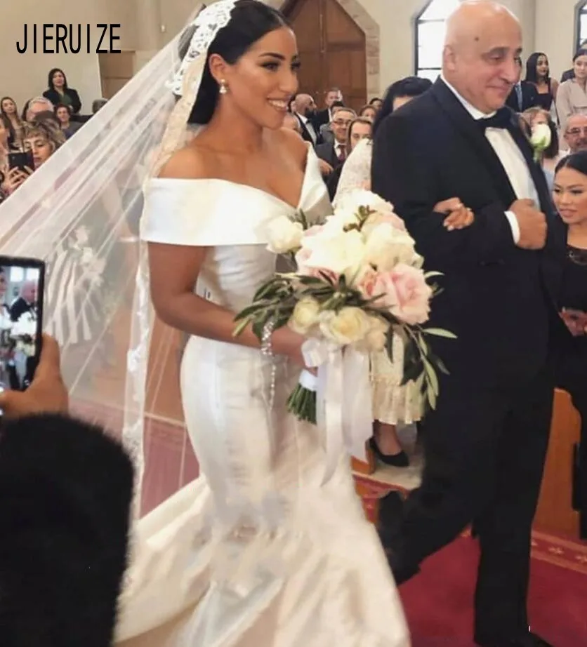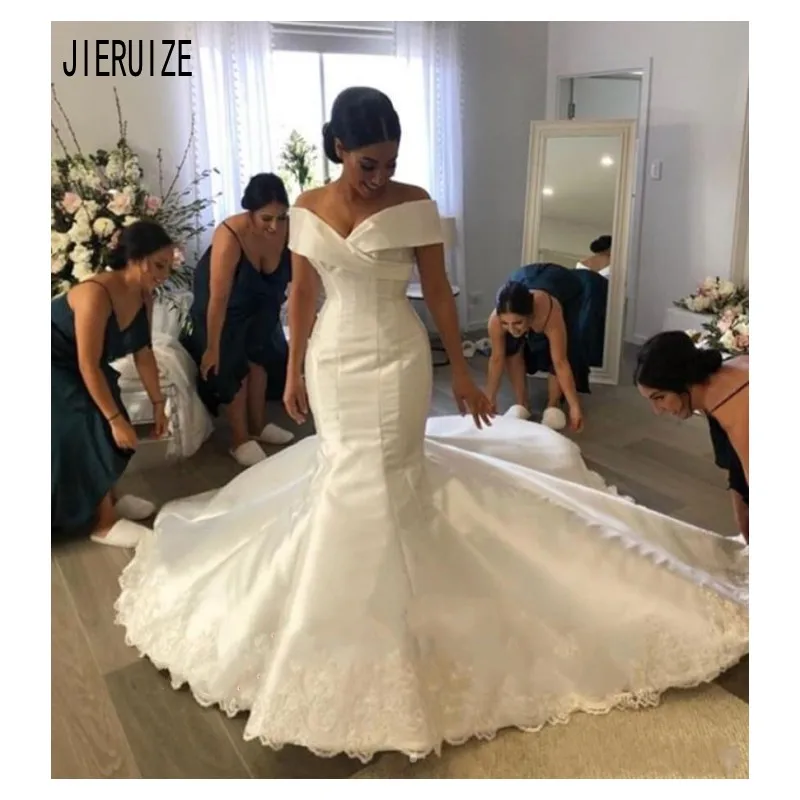 Женское атласное свадебное платье с юбкой-годе, открытыми плечами и аппликацией