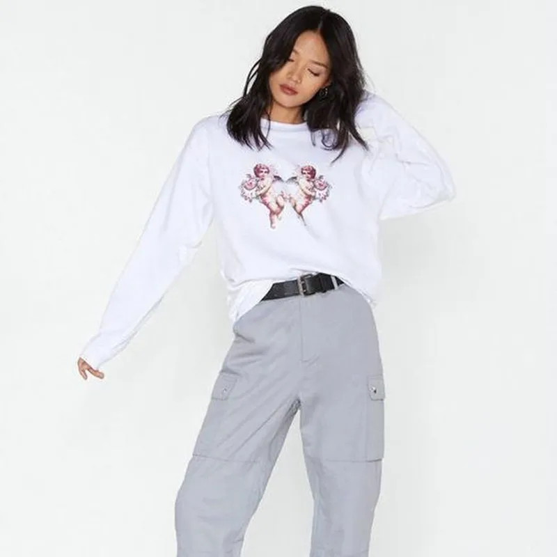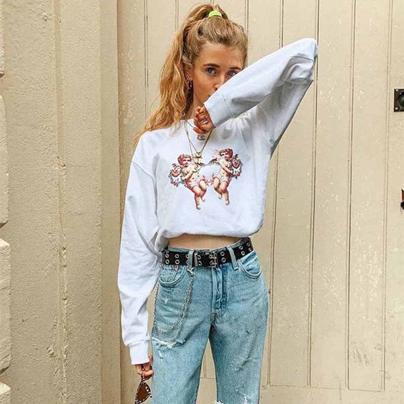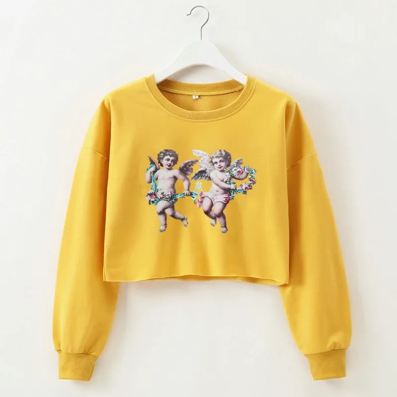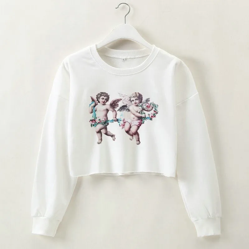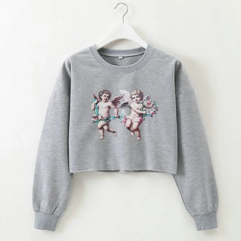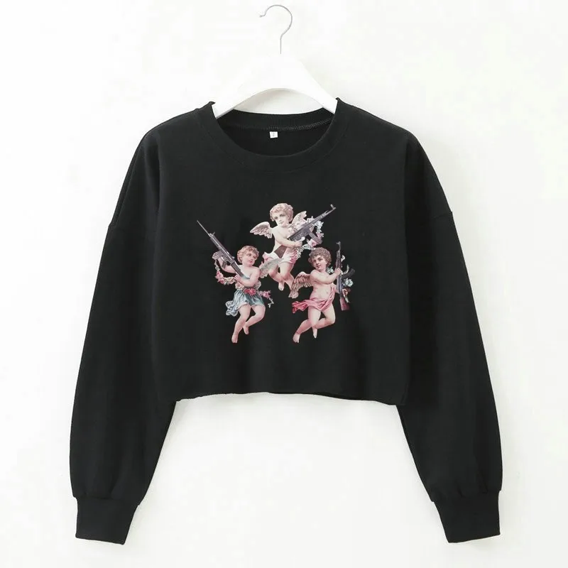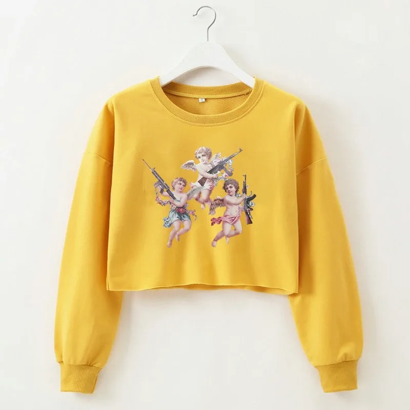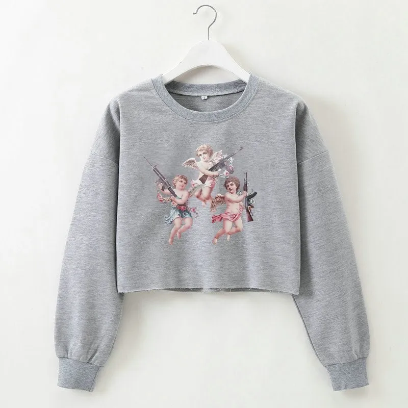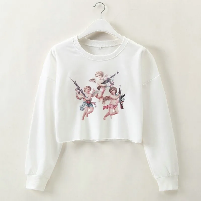 Женщины Crop Top Толстовка Cute Angel с пистолетом Печать Пуловеры Мода Твердая длинным рукавом потеет Топы Kawaii Hoodie Dropship