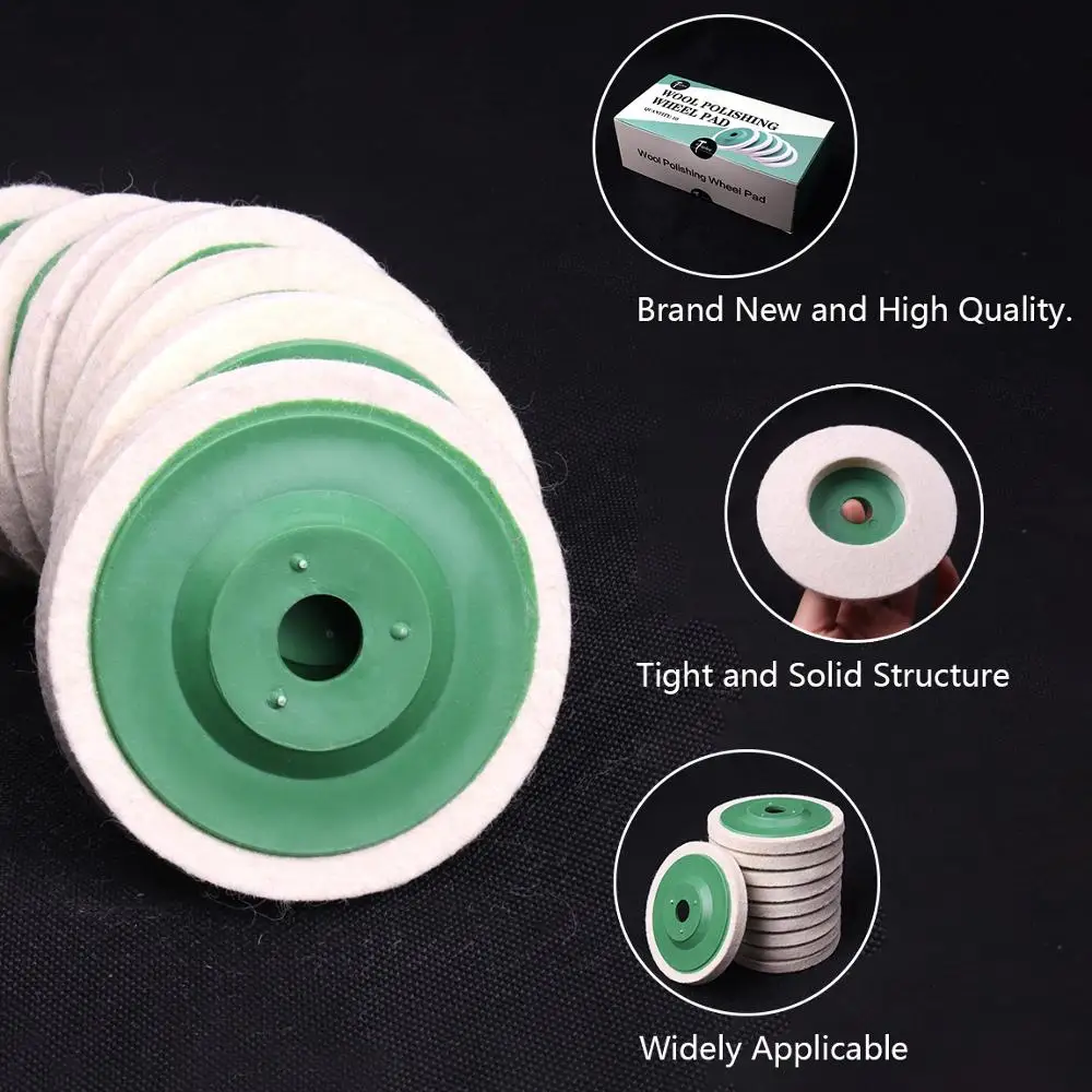 Высококачественный материал-эти прокладки изготовлены из мягкого эластичного шерстяного материала, который является безопасным, экологически чистым, прочным и износостойким и имеет более длительный срок службы. Тонкий и чистый белый, нелегко пролить, эффект полировки и срок службы намного выше, чем у обычных шерстяных колес.