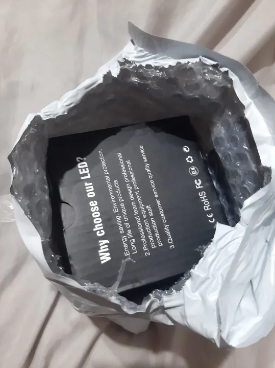 посылка пришла быстро, упаковка не много помятая,но все работает, только одна лампочка горит ярче второй