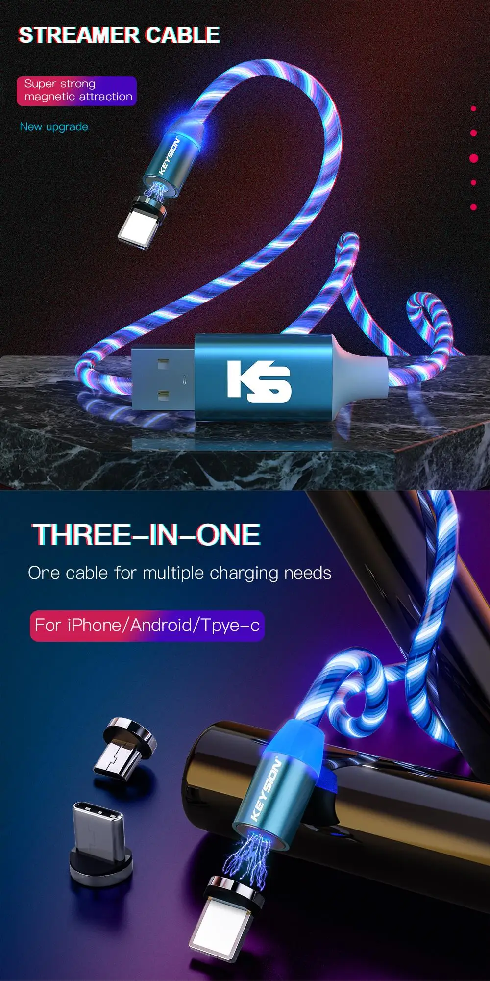 KEYSION Магнитный кабель течёт светильник светодиодный Micro USB кабель для samsung type-c Зарядка для Xiaomi для iPhone магнитные зарядные кабели