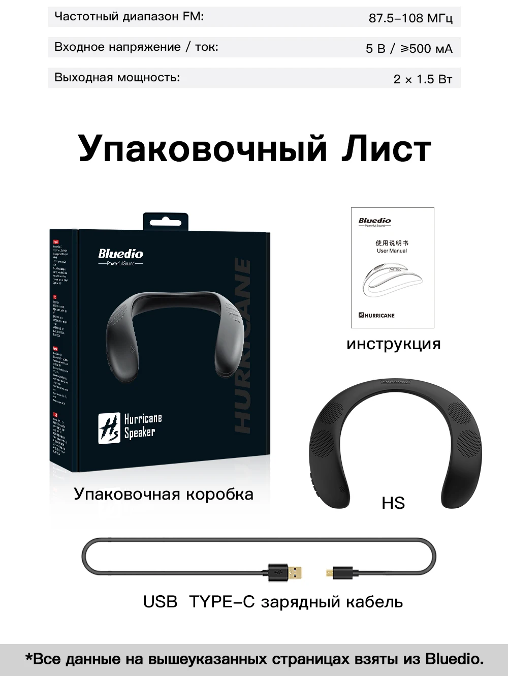 Беспроводная Bluetooth-Колонка Bluedio HS, с креплением на шею, с поддержкой bluetooth 5,0, с басами, FM-радио, поддержка слота для SD-карты