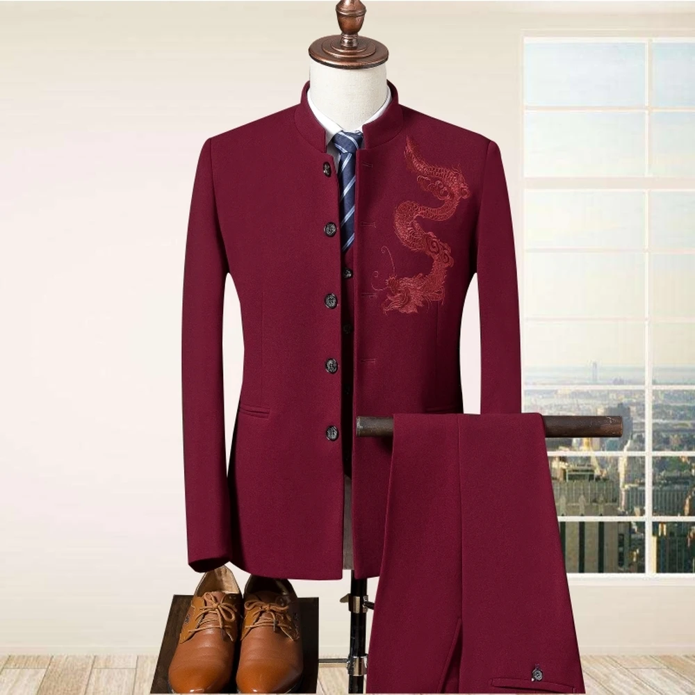 Мужской классический деловой костюм в китайском стиле, с китайским воротником и вышивкой дракона, вечерний костюм из 2 предметов