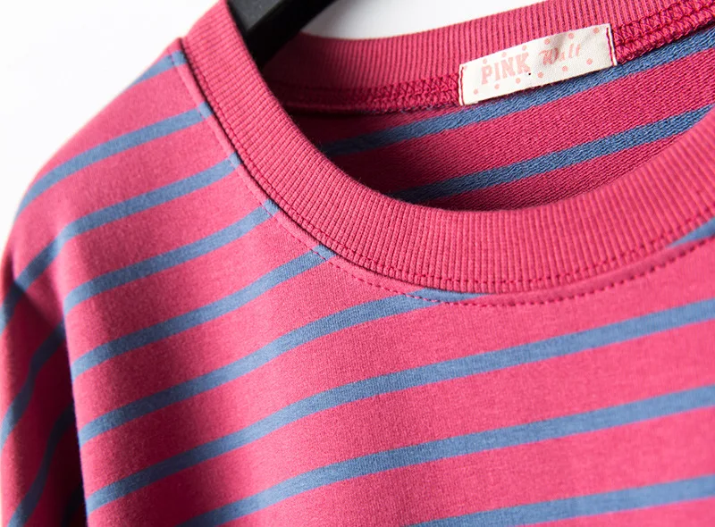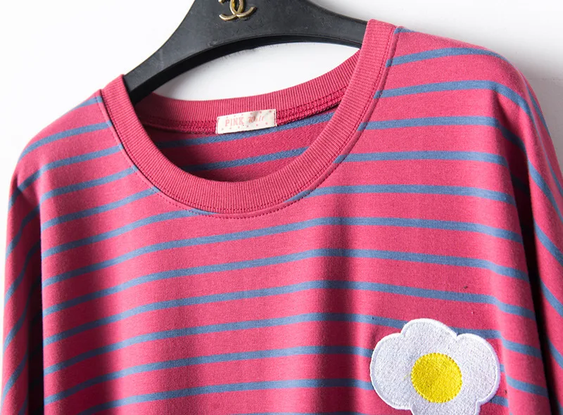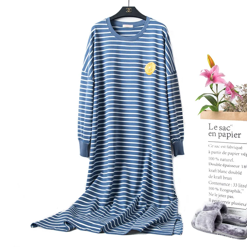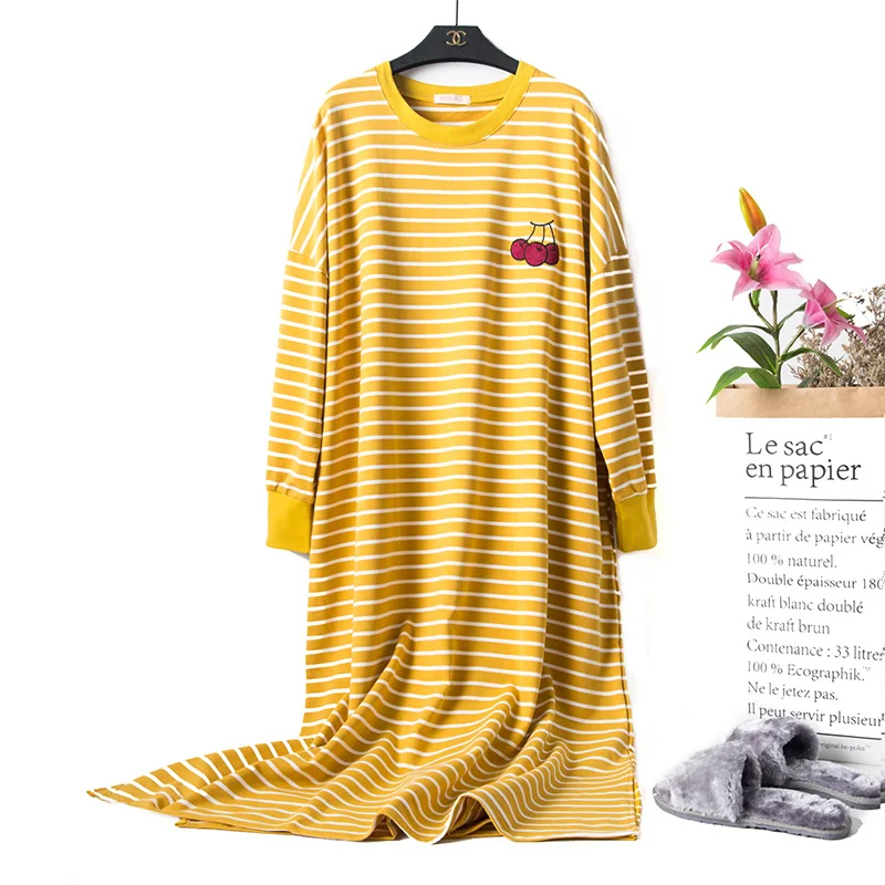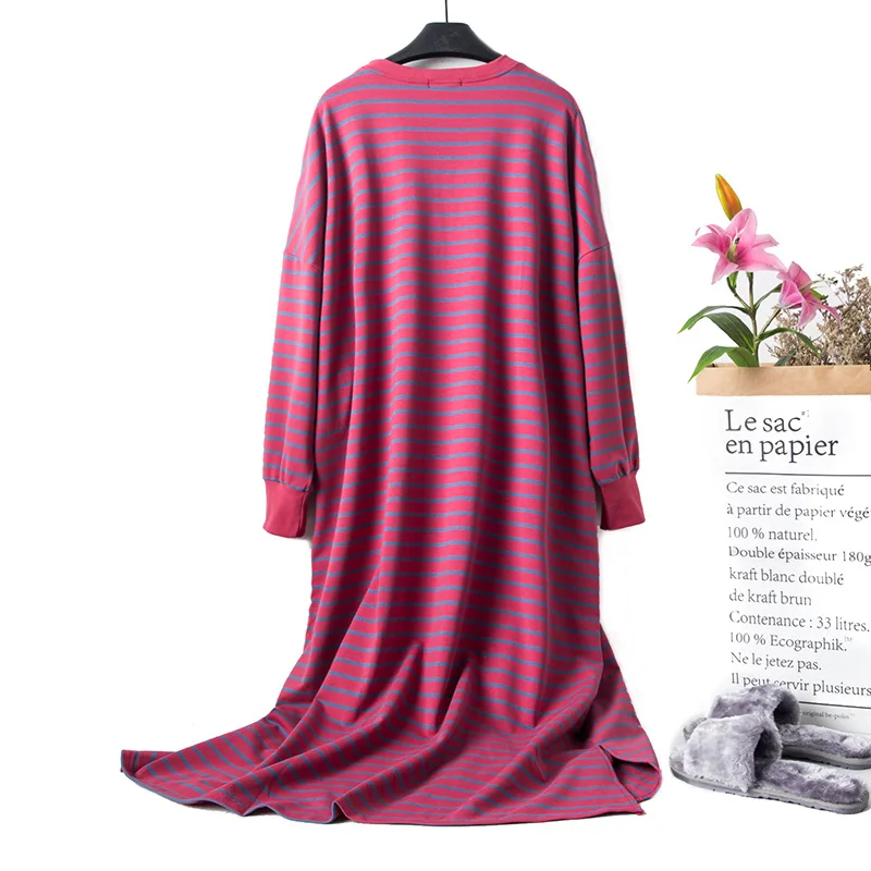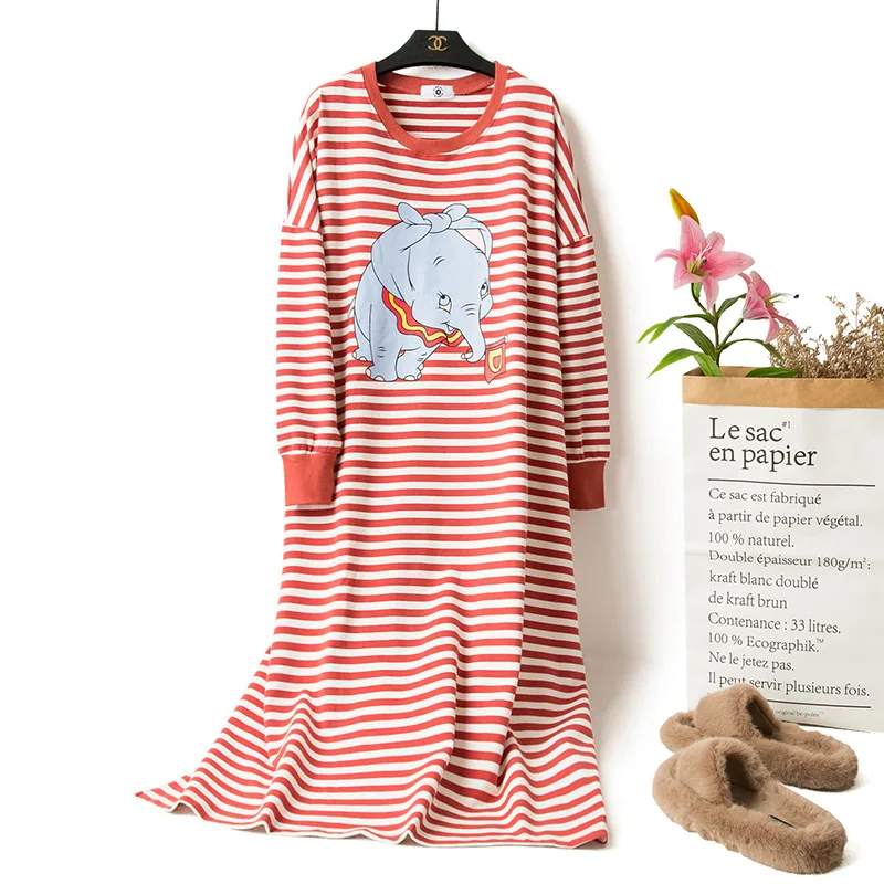 Новинка Весна 2021, свободная женская ночная рубашка с длинным рукавом и мультяшным принтом, хлопок, в полоску, махровые ночные рубашки, ночная рубашка большого размера для беременных женщин