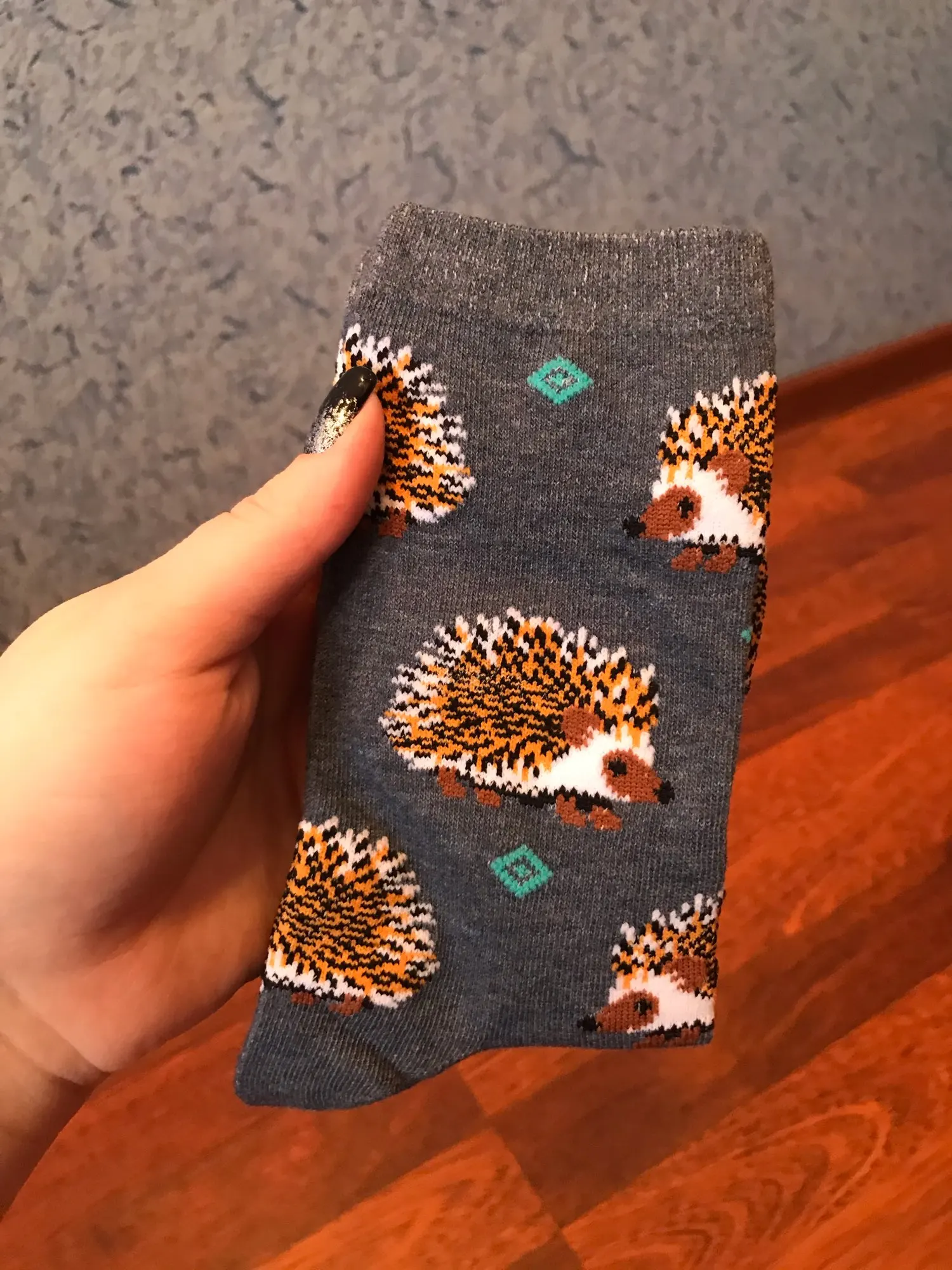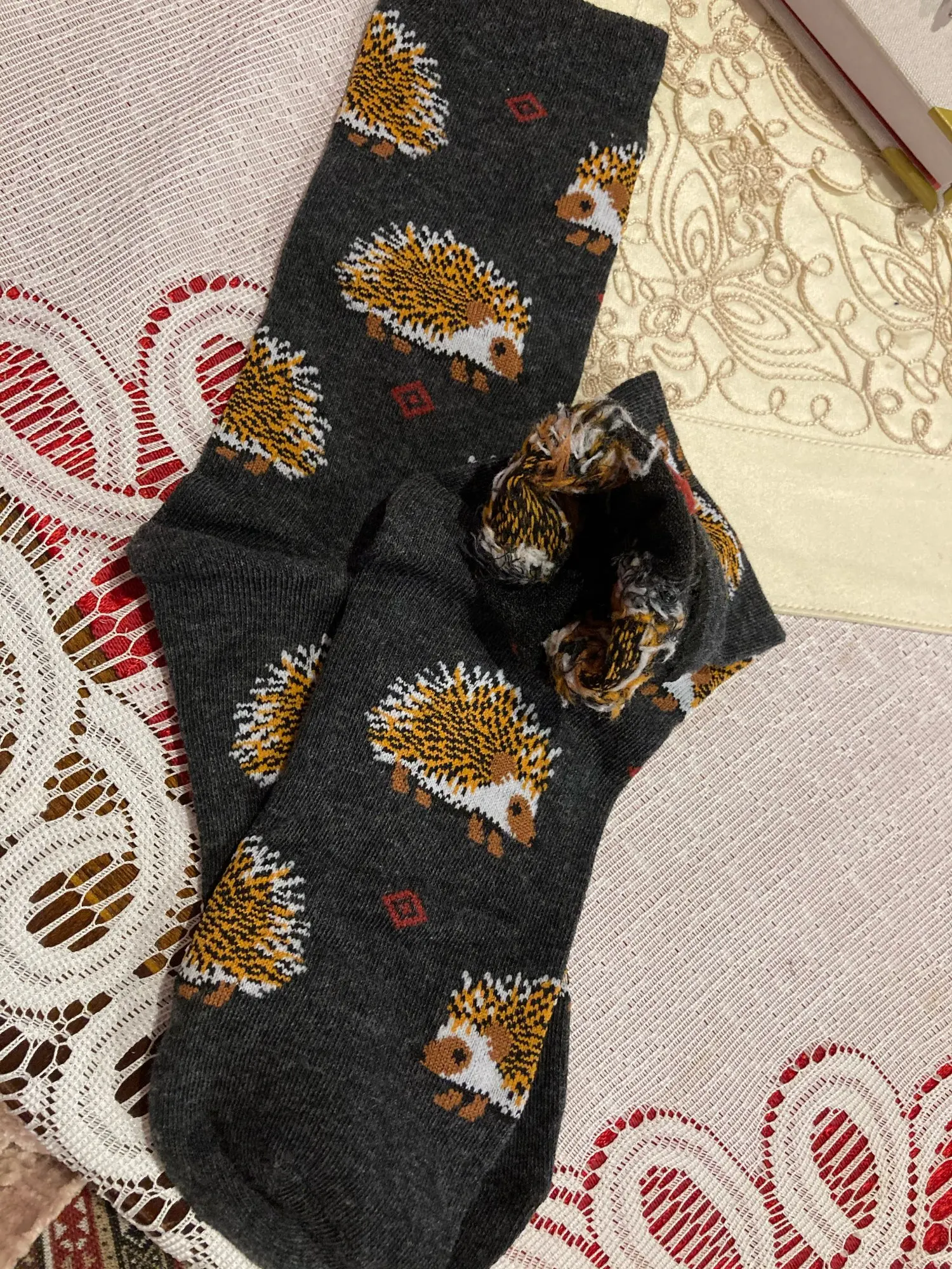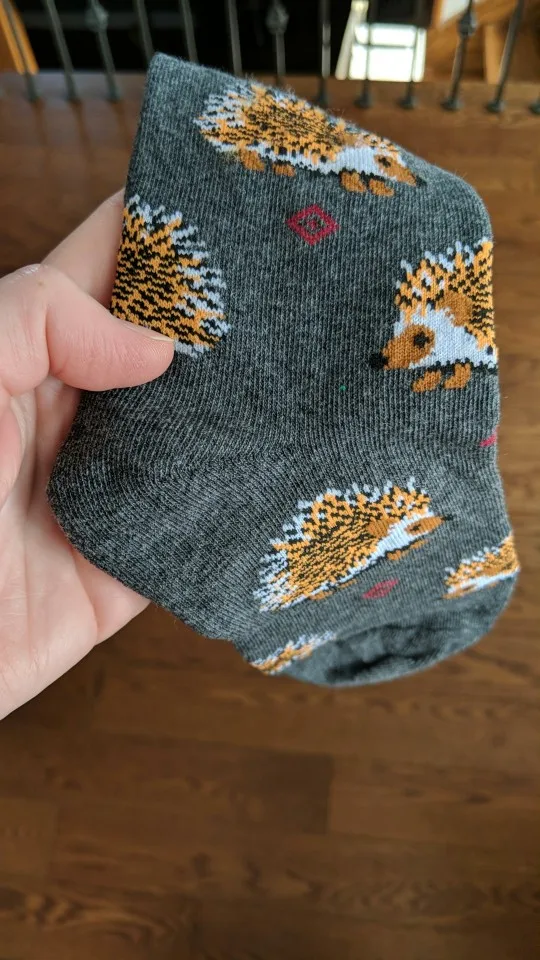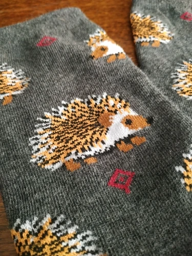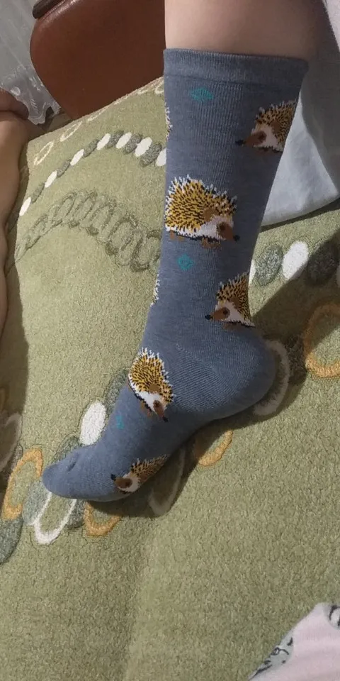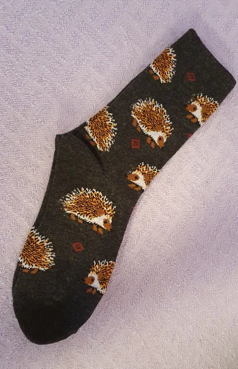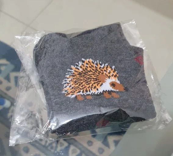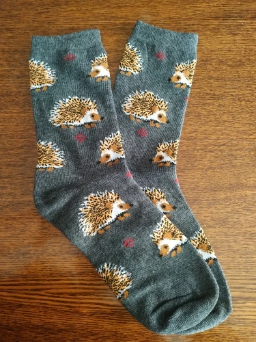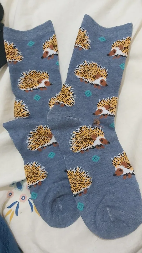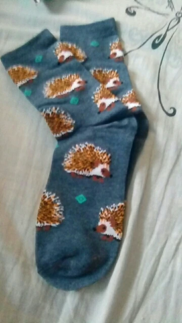 Носки высокие, резинка плотная. Размер довольно таки большой, но на мой 38 сели прекрасно, не велики. Рисунок сделан хорошо. С продавцом не общалась, отслеживание не проверяла. Был объединён с другим товаром, у которого доставка Saver Shipping, поэтому вместе пришли в Пятёрочку всего за 1,5 недели. Товаром очень довольна, эти ёжики супер милые:)