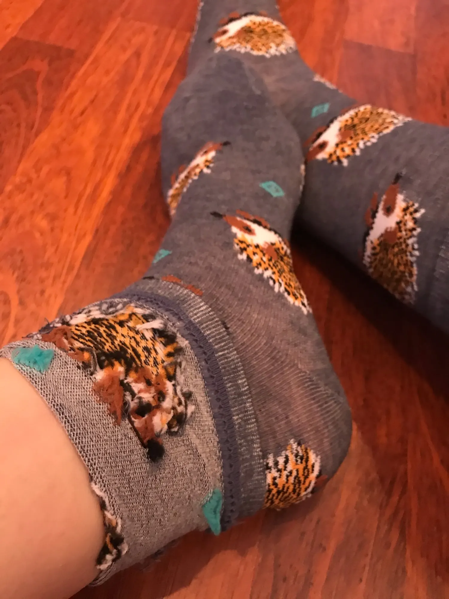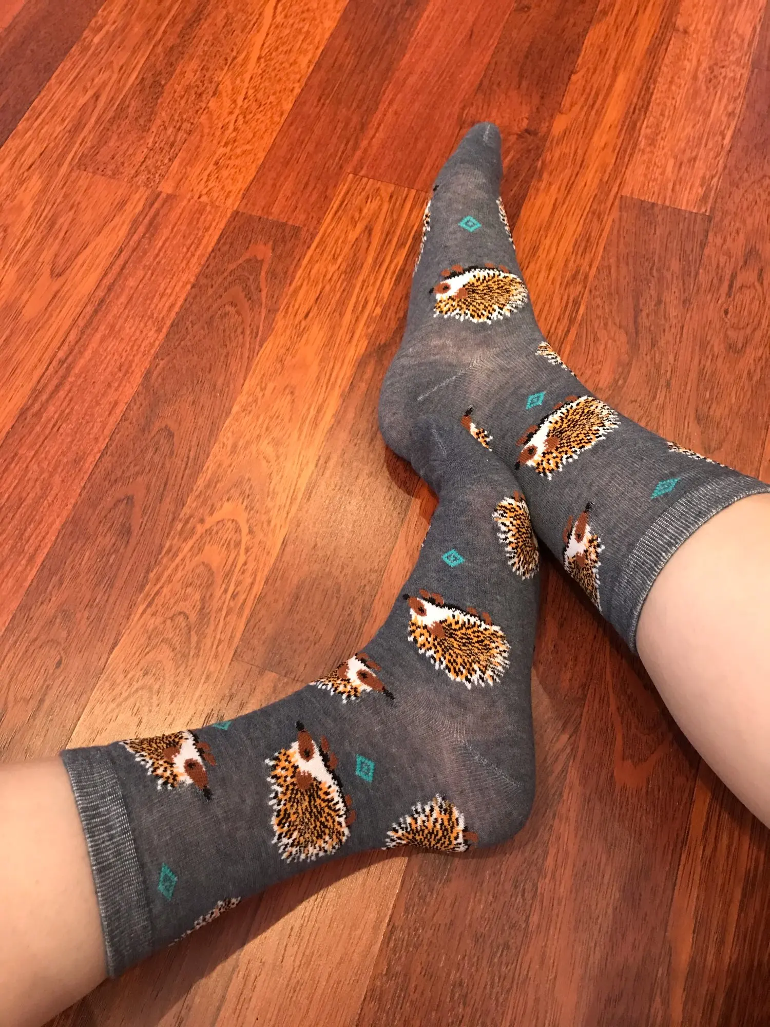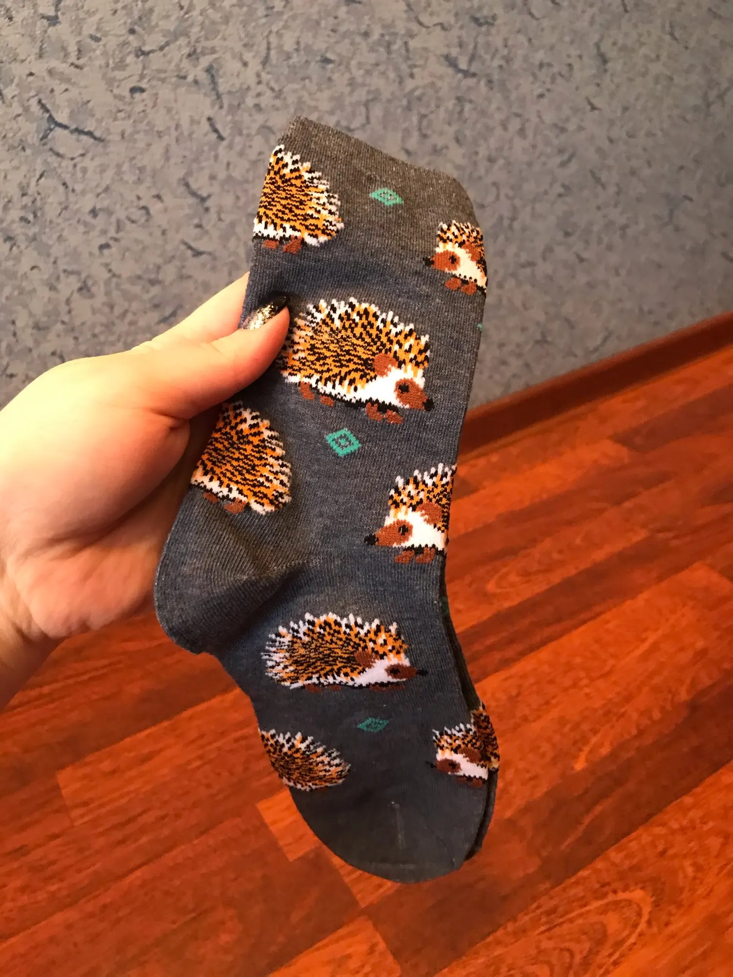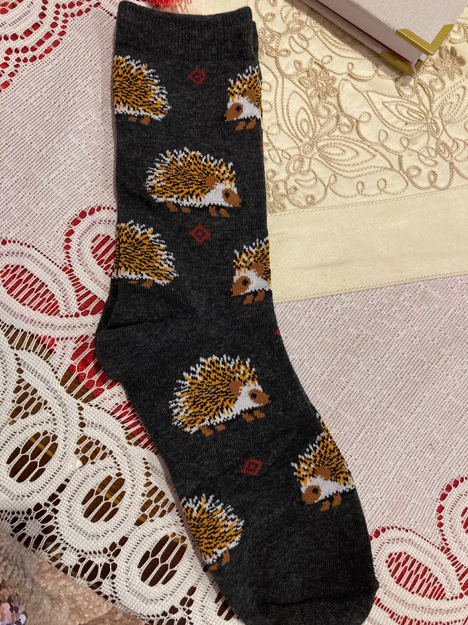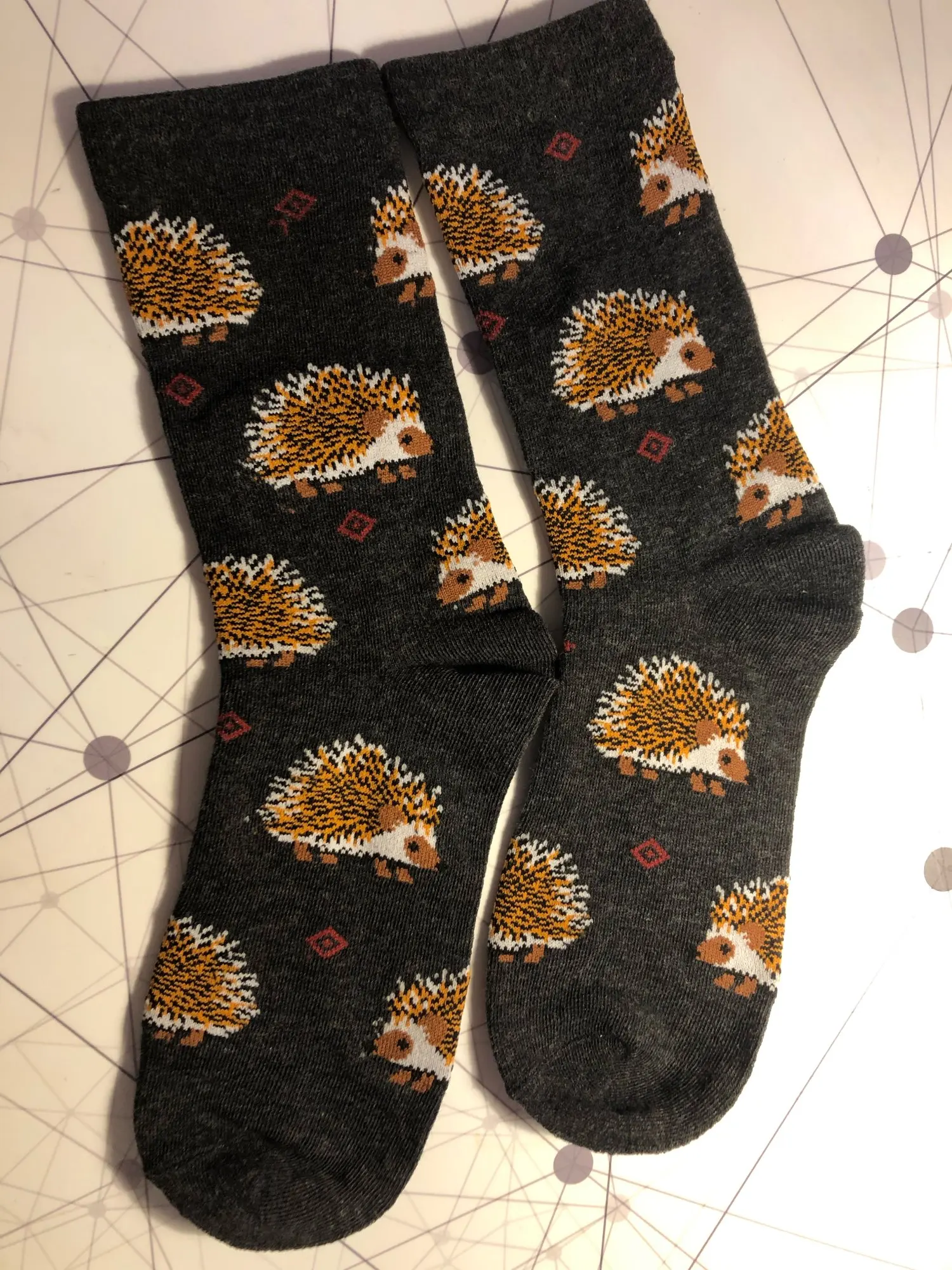 Носки высокие, резинка плотная. Размер довольно таки большой, но на мой 38 сели прекрасно, не велики. Рисунок сделан хорошо. С продавцом не общалась, отслеживание не проверяла. Был объединён с другим товаром, у которого доставка Saver Shipping, поэтому вместе пришли в Пятёрочку всего за 1,5 недели. Товаром очень довольна, эти ёжики супер милые:)