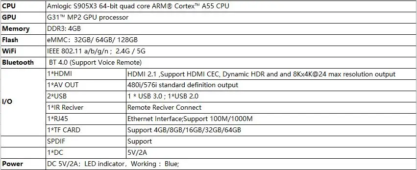 -CPU: четырехъядерный процессор Amlogic S905X3 ARM Cortex A55;
