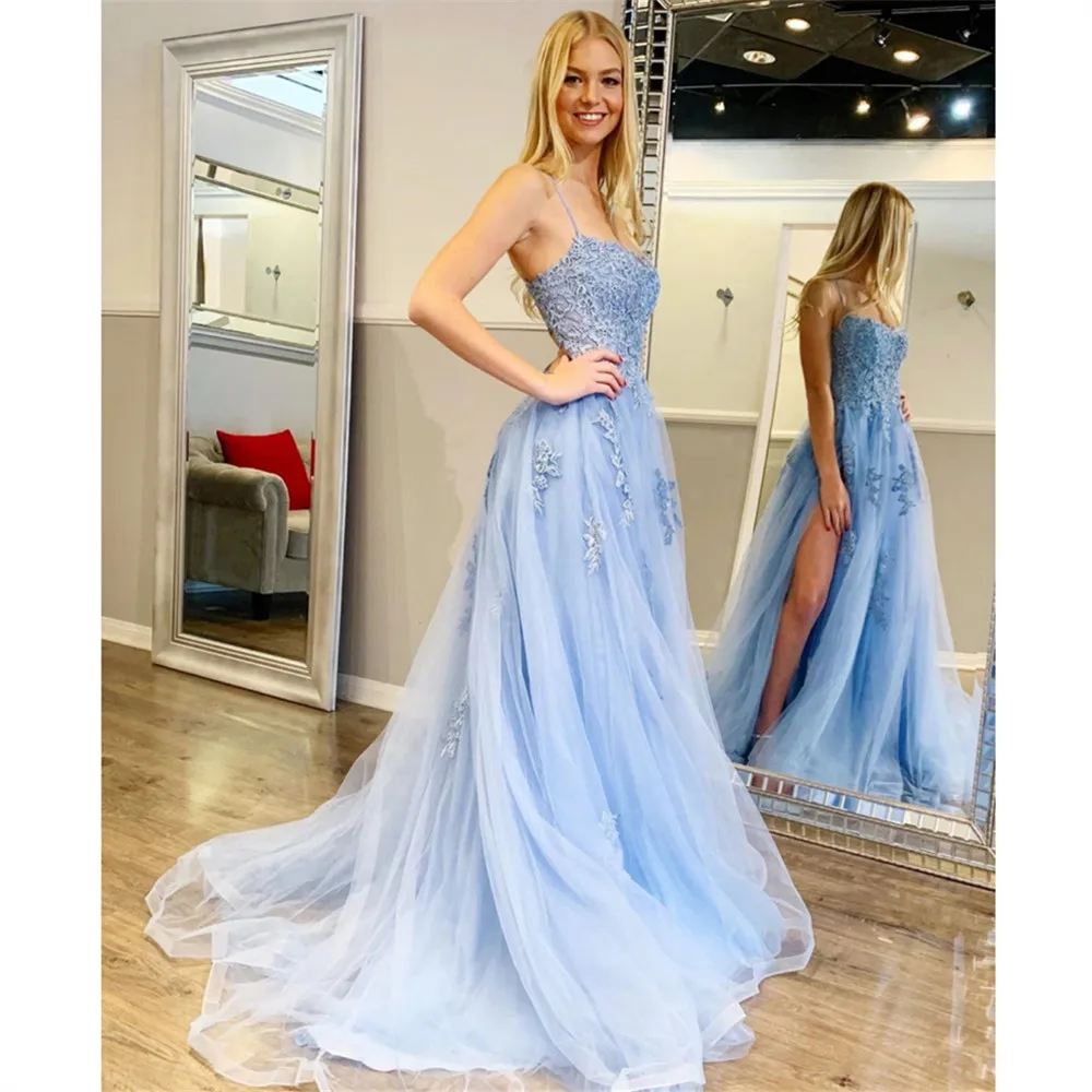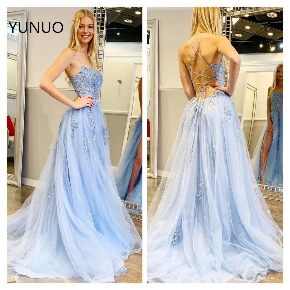 Потрясающие небесно-голубые платья YUNUO для выпускного вечера, тюлевые трапециевидные платья для торжества, официальная одежда, корсет на шнуровке, вечерние платья